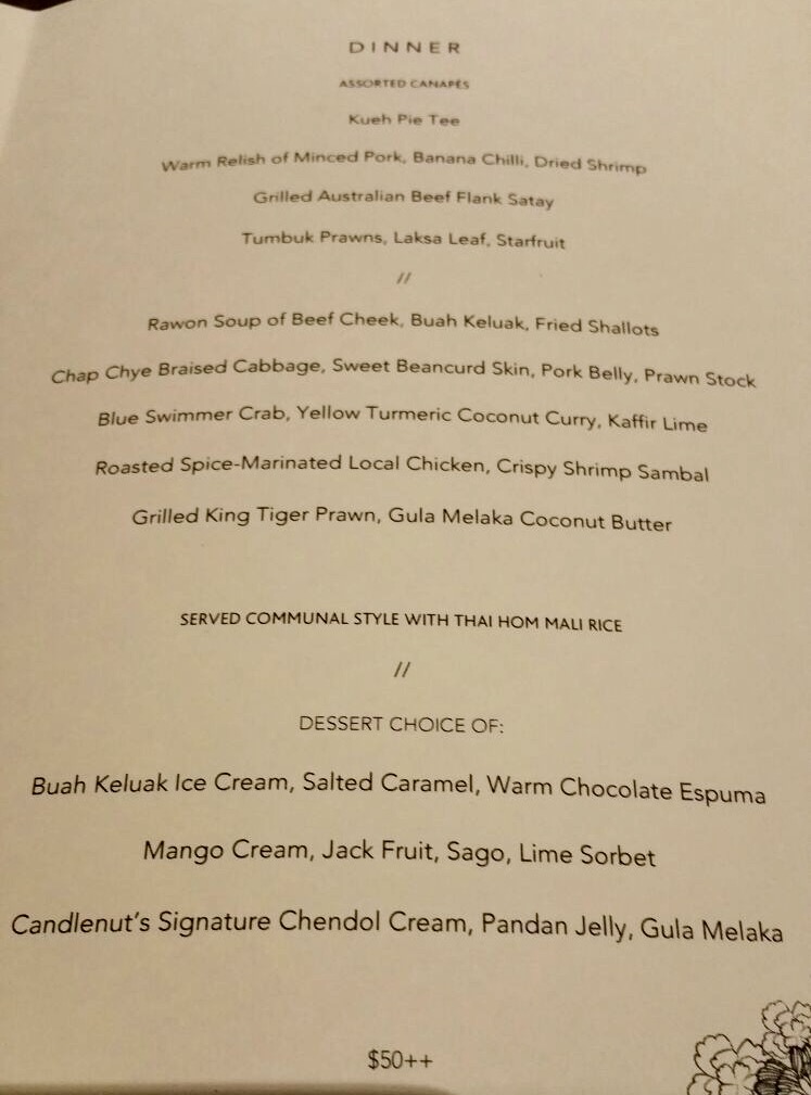 (1) Venue 6.5- I’m good as long as it’s clean, cool and comfy. Didn’t get a chance to visit the poopoo private powder room coz of my “public places” phobia but the place smelt nice, what with the humongous flower display they bothered with. The rest of the ambience was just “leftovers” from a different place and time not quite Nonya. (2) Taste 8- I don’t usually like to eat but tonight I rolled everything twice in my tongue and sucked hard 😜. As always, a good experience leaves me in tears but I guess the spicy chillies had a part to play in this crossbreed peranakan-ish usurious experience. I died and then died again and gladly accepted another pound of flesh. FORK to the things I forget. But I’ll tell you what I’d SPOON with all night: the stick of heavy beefy meat they call a satay but I say it should be called STAY cos it belonged in my mouth; all night long. The other dich that got my palate WET was the crab in turmeric curry. Owh! This was the LADY-dish of a lifetime. Creamy, moist coconut thick, pungent and tangy. You can never imagine crabbier pleasure than this painful bitter sweet romance. Then before dessert, we were served the most delectably small treasure cup of star fruit sorbet with Jambu. OMG. Jump my boo anytime please but he made me wait, prolonging the longing, with strangely green sperm-shaped chendol, finished and sprawling atop a handful of white creamy custard. I definitely moaned aloud at the first SPOONful. Capital SPOON, albeit small, cos too much will surely give you a heart attack. Enjoy slowly, as you would, foreplay because nothing better will cum after ☺️. Note: Oh yah. FORK the Chap Chye for its diabolically (spelt diabetically) imposterous attempt. (3) Service 7.5- Effort mostly from the libido of the chef’s exertion and not from the frigid service staff. (4) Value 8- At 50 bucks a pop, I think OMAKASE frees you from preconceptive expectations but instead, in all shades of grey, allows you to respond in a submissive euphoria of surprise. Try it. I’LL LEAVE IT TO YOU to decide. (P/S: I went back for seconds the same week.)