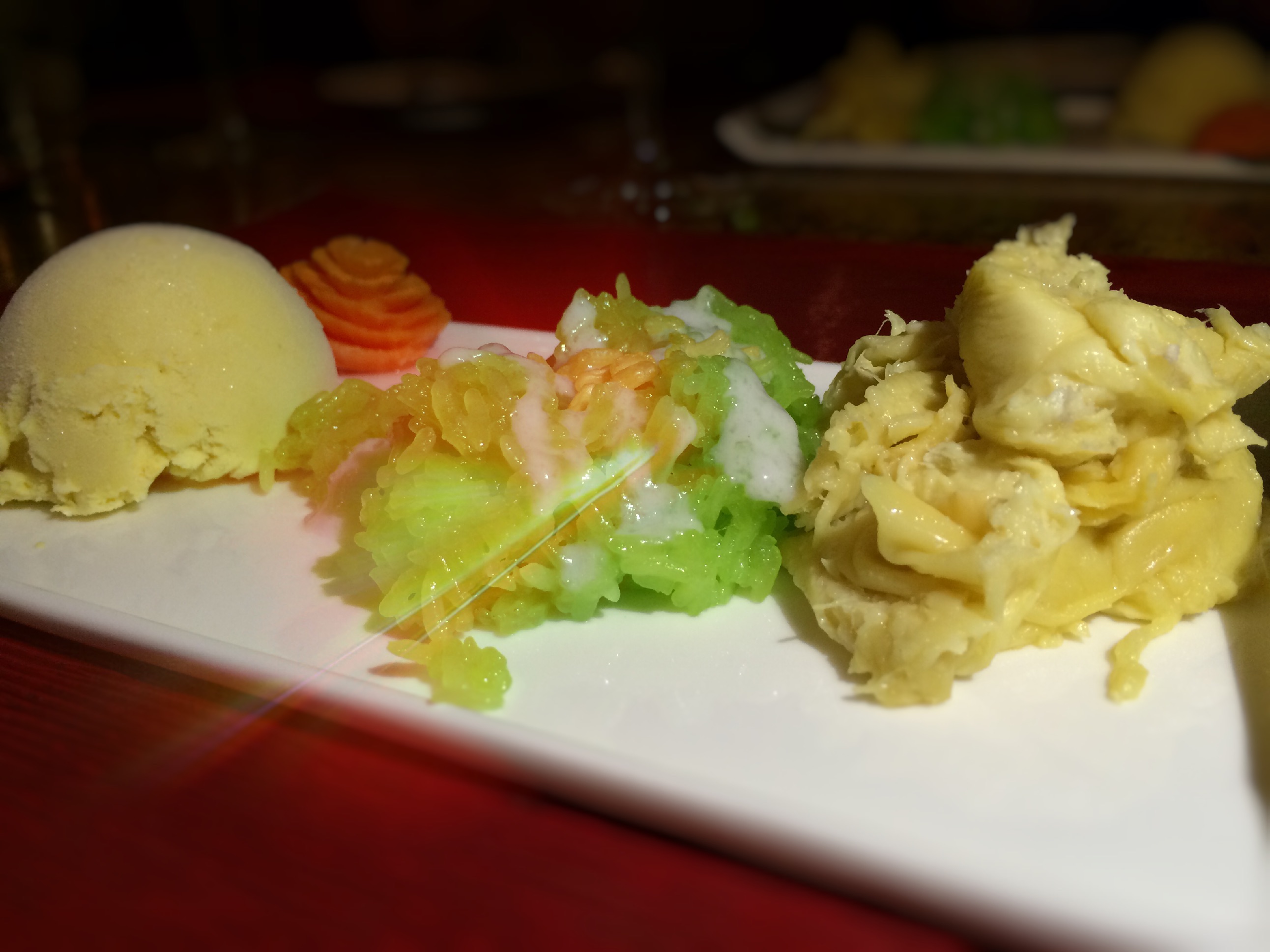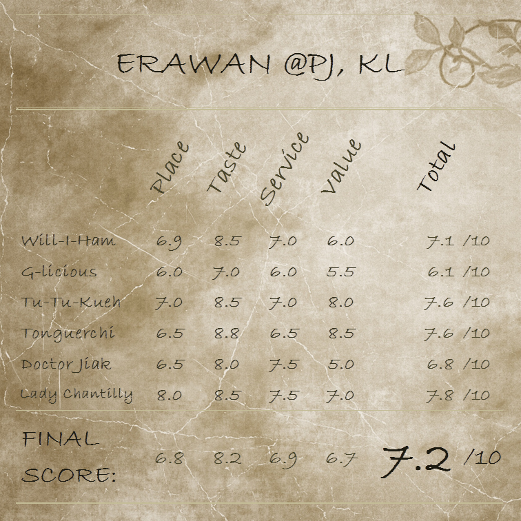(1) Venue 8 – You feel like you are walking into co-owners / brothers, Chef Korn and Anan’s intimate and cozy house. Tastefully decorated albeit a tad cramped with the restaurant running a full house. The owners’ attention to detail is very obvious. The restaurant is always adorned with huge displays of bright coloured orchids. G.licious and Tonuerchi were impressed with the cleanliness and dryness of the quirky washroom. G.licious NEVER uses public toilets in Singapore…let alone the ones in Malaysia! (2) Taste 8.5 – Chef Korn is self-taught kitchen maestro who hails from Chantaburi. He learnt how to cook from his mother at a young age, perfecting his dishes and presentation. The chef has also mastered the art of royal Thai cuisine whose grandmother used to cook in the royal palace. Each dish is beautifully presented in exquisite Thai cookware. Diners are highly encouraged to browse the menu on Erawan’s website to pre-order a day ahead for popular dishes. This ensures the ingredients used are delivered and prepared on the very day. Their appetizers are my favourites. Whenever it is mangosteen season, I’ll head there for the Chef Korn’s special Mangonsteen Salad. My friends were rendered speechless (very rarely) with their first mouthful. I stared at Will-I-Ham and Tutu Kueh’s faces (well, they were sitting across from me) and watched the expressions on their faces. Experiencing the explosion of flavours of the juicy sweet mangosteens, squid, prawns, minced chicken, shallots and mint leaves, balanced with the refreshing tangy sauce. There was this harmonious balance of sweet, sour and hot lingering in their mouths, slowly tantalizing their taste buds. O-R-G-A-S-M-I-C!!!!! That’s how I feel every time I savour this exquisite appetizer. My second favourite appetizer is Royal Lotus Petal Snack. I have never seen this appetizer on other Thai menus. It is a Thai Royal snack, which is similar to Miang Kham which the Thai common folk wrap the aromatic condiments with betel leaves. The lotus flowers are homegrown by the restaurant and each delicate white and pink petal is carefully selected. Not many Thai restaurants serve the Pomelo Salad, which had always been my favourite since my younger days. Well, till the flawless Mangonsteen Salad came into my life. I’m still enticed with the Pomelo Salad. Whopping chunks of sweet-sour pomelo, enhanced with Alaskan crabmeat, meaty prawns with a generous topping of grounded roast peanuts and fried shallots. The sauce is served on the side to prevent the crunchy ingredients from getting soggy. Erawan’s uses the best ingredients paired with simple Thai herbs and spices. You will find Australian beef and lamb, giant river prawns and Alaskan King Crab in their main dishes. However, my favourite main dish is the humble see-hum (blood cockle) curry. I have introduced this cockle curry to many see-ham lovers, who now refuse to share this dish with more than 1 person on their subsequent visits. I have NEVER eaten any cockle that is larger or more succulent than the ones served at Erawan. The curry is rich and flavoursome. The cockles are cooked to perfection. They burst in your mouth, never overcooked. Accompanied with white rice. SECOND ORGASM. Oooooh Wow! Another special mention at Erawan is the availability of unusual vegetables on their menu. Humming bird flower, Water lily stem, Chayote and Climbing wattle are amongst their seasonal selection. The finale for my dining experiences at Erawan will always be the Durian Platter. I’m a dessert fanatic. Unfortunately, stuffing myself on see-hum curry and rice every time does not leave room for dessert. My love affair with the Durian Platter began earlier this year when I curiously asked Chef Korn’s brother, Anan, why the platter is priced at RM50, which is a rather hefty price for dessert. Anan emphasized that they only use the highest grade of durians, Musang King durian, or the next grade if Musang King is not available. It would not hurt to try it once to see what Anan is bragging about. We were shocked at the small plate of the pricey dessert placed before us, consisting of a serving of the bitter sweet King of Durians, rich creamy homemade durian ice cream and salty sweet green glutinous rice. Anan strongly recommended each spoonful should be a combination of the trio. Let’s just say 4 ladies shared the durian platter and every single one of us were lusting for a second order of this decadent dessert. Since that fateful encounter, it’s the FINAL CLIMAX for me and every durian-loving friend of mine! (3) Service 7.5- They were understaffed with a packed hectic restaurant that night. Anan, forever the attentive gracious host, still sat down at every table to take their orders. He would magically appear the moment your dish is served, to explain each dish in detail. Chef Korn rarely appears at the front of house. I told Anan, Erawan was top of my list of restaurants to introduce to my best friends from Singapore on this visit. Anan brought his brother Chef Korn to meet us. Both brothers were very accommodating and obliging to my besties’ requests for numerous group photos. (4) Value 7- Award winning Erawan’s Thai classic cuisine is as fine as they come. This is not the typical Thai restaurant fare you would encounter. Many first-time diners are not expecting to pay so much at a restaurant tucked away in a nondescript neighbourhood, a long way from the bustling city lights. Prices have increased substantially since my first visit to Erawan after moving to KL but I can attest that Erawan is still probably the best Thai restaurant north of Singapore.