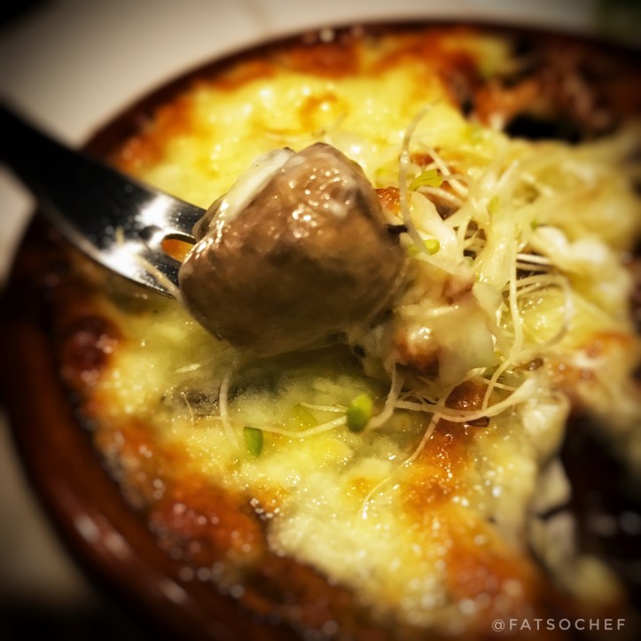 Hot starter, Gratinated Champignon with Mozzarella is a mimic of Escargots à la Bourguignonne. Baked in the same snail casserole, little round button mushrooms sit in a sea of melted gooey mozzarella. Now who doesn’t love a gooey cheese! Not to mention the piping hot juicy mushrooms were much easier to handle than snails in shells! No awkward Pretty Woman in the house!