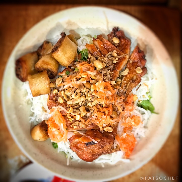 If you enjoy cold noodles like me, and have not tried a Bún Thịt Nướng (Vietnamese Rice Noodles with Grilled Pork), you gotta! This dry version comes with one of the best dips/ dressing in the world, Nước Chấm, a sweet-sour fish sauce with crushed peanuts, chili bits and shredded carrots. A pile of precooked vermicelli sits on a bed of shredded lettuce, mint leaves, cucumber and carrots. Toss everything together with the dressing and it is an explosion of fresh minty flavor in the mouth. The large slab of grilled pork chop is well seasoned and tender; and adds bite and savoriness to the refreshing noodles. Order the Chả Giò (Vietnamese Fried Spring Rolls) version if you fancy some delicious spring rolls with your noodles instead of pork. Just as yummy!