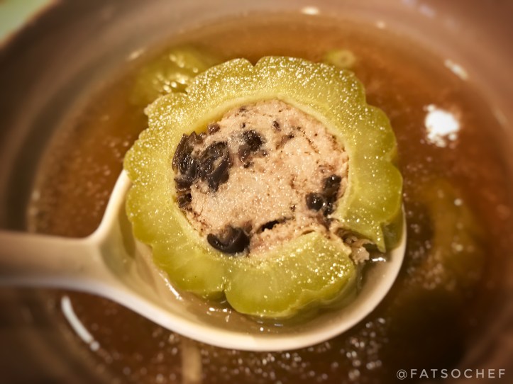 Canh Khô Qua or Bitter Gourd Soup. Bitter gourd cut into rings, stuffed with seasoned meat and cooked in a clear broth that’s peppery with bitter tingles from the melon. You have to enjoy this bitter veg to appreciate this dish. I do but I wouldn’t think it’s for everyone.