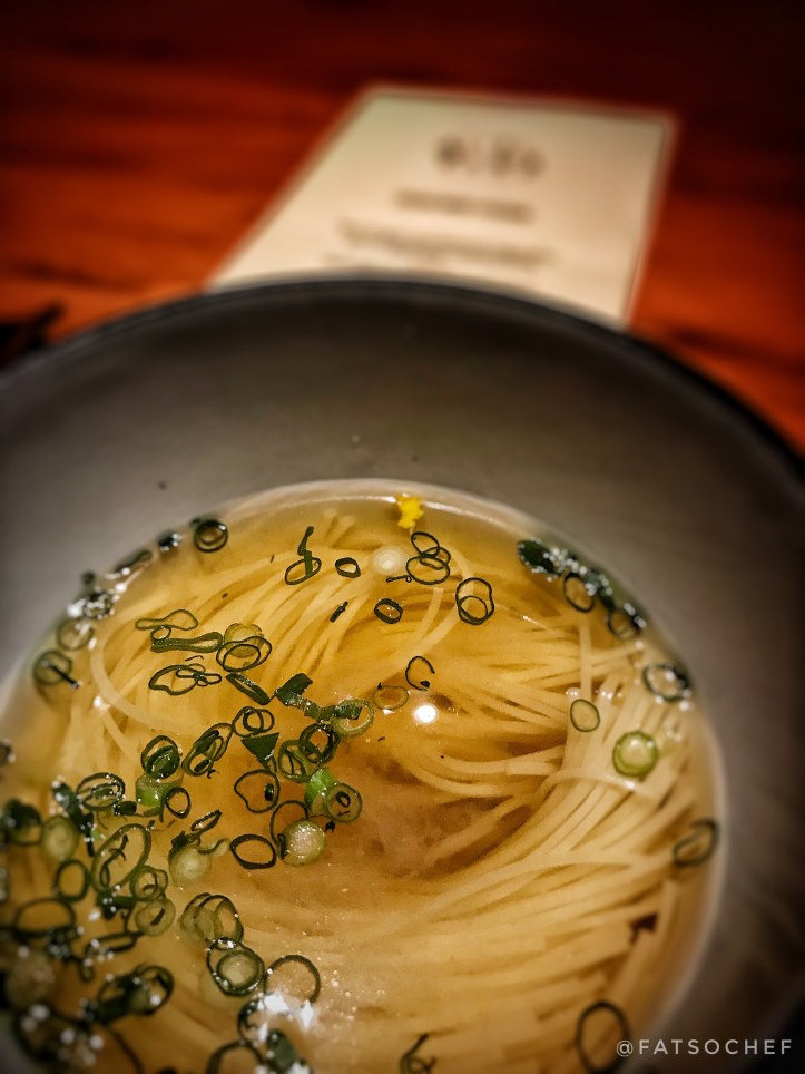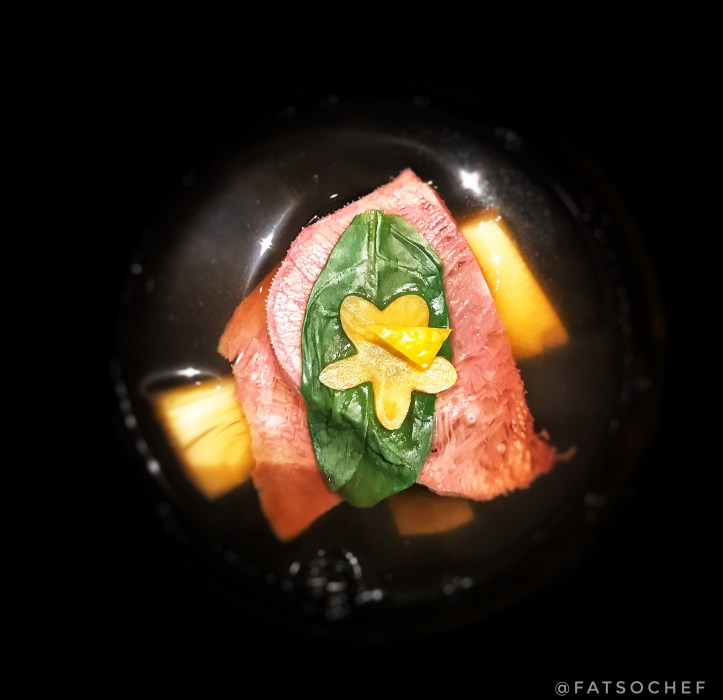 2 slices of soft tender beef tongue in a lightly flavored consommé. Starting with one of my favorite part of the cow was a good idea. The flavor was light.. laced with just enough warm consommé to whet your palate. It wasn’t OMG-Wow, but it impressed in a quiet elegant way.
