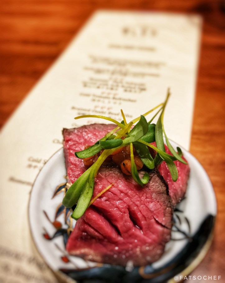 A grilled rump cube sliced and flavored with grainy miso barley. The cold lean beef had a good bite without breaking the jaw. And miso barley? A wonderful way to add flavor and texture to the meat.