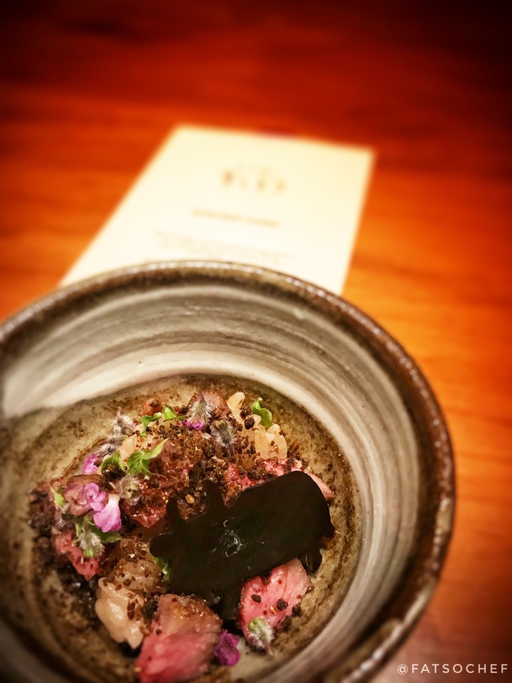 Not entirely raw for the benefit of customers whom may be uncomfortable with raw beef; but a good blue. When beef is aged beautifully, there are no signs or scents of any bloodiness. This was the perfect example of beautifully aged meat. Lightly seared and served over fragrant sushi rice topped with petals and leaves for condiments… simply beautiful!