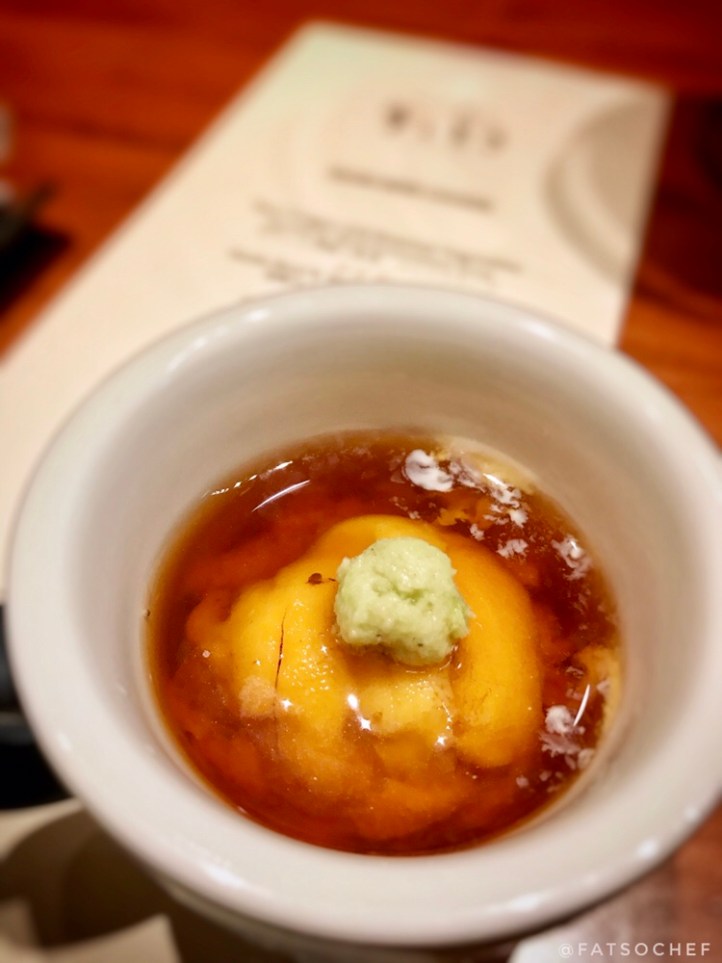 The first, technically, Sea Urchin with Tofu in Jelly! The tofu is made with the curdled layers of soy bean milk while the jelly derived from a light beef broth. It is soft over soft over soft; creamy sweet sea urchin smelled and tasted fresh as the sea; an au natural curdled soy bean pudding, and a wobbly salty jello! A smooth explosion in the mouth!