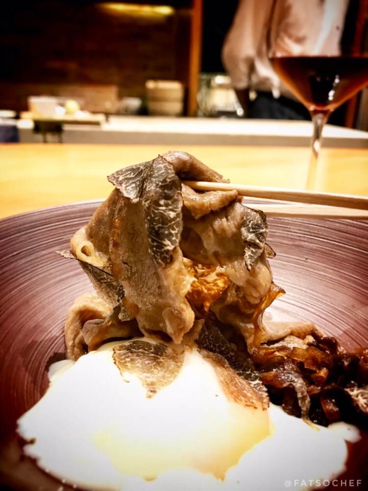 A little drizzle of the precious sukiyaki sauce and shaved truffle to finish. Sink the beef into the gooey egg, the truffle inadvertently sticks to the now gluey moist meat… my eyes rolled back in joy and contentment as the perfect beef fills my mouth. True bliss!
