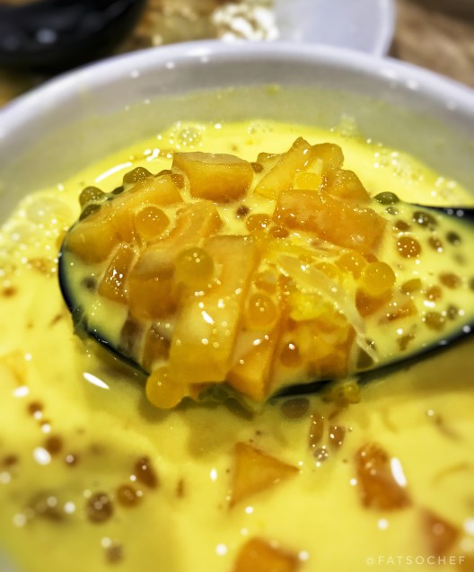 A good Chilled Mango Sago Cream with Pomelo (杨枝甘露) keeps you wanting more. If it’s too sweet, too sour, too milky, or too mushy? Something’s very wrong! Creator, Chef Tony blames it on pure cost cutting tactics; canned and frozen ingredients instead of fresh, being the most infamous lazy way out! The chilled soupy dessert has 3 main ingredients; freshly peeled sweet pomelo flesh, freshly cooked soft gummy sago pearls, and sweet fresh mango cubes all swimming in a milky mango juice. It’s lightly creamy and just sweet enough to let the teeny bit of tartness shine. The perfect finish to a meal that quenches thirst, refreshes the palate and sweetens the taste buds. After sampling one from Tony’s very own kitchen, I have fallen back in love with this old classic from the 80s!