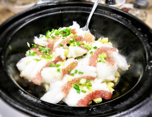 Salted Garoupa Slices (盐焗星斑球)– Traditionally, you’d be served the entire fish, head and tail intact at any respectable Chinese restaurant. Chef Tony decides to debone the fat Grouper and pressure cook the chunky fish slices within a scorching hot claypot carpeted with ginger. Our server lifts the lid, revealing a puff of hot gingerly steam and snowy white fish chunks sprawled across the surface. The fish was perfectly cooked. Not a second over. Ocean fresh sweet moisture in every piece. The aromatic ginger and scallions flavored the meat subtly. It was exceptional!