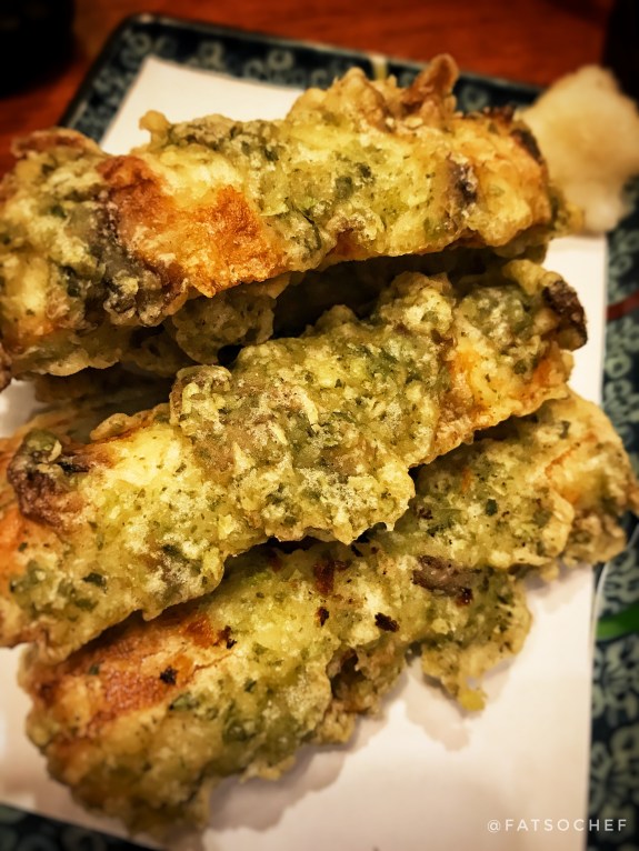 Natto Tempura– Natto beans are wrapped/ smeared in seaweed, coated in Tempura batter and fried. Dunk it in the daikon laced tempura sauce and much (but not all) of that icky, sticky, funk diminishes. For me, it was absolutely delicious. I’ve never had natto this way, and I do love Tempuras. You get subtle bursts of the soybeans in between bites. It was pretty perfect and in my opinion, a gentle introduction to those new to Natto!