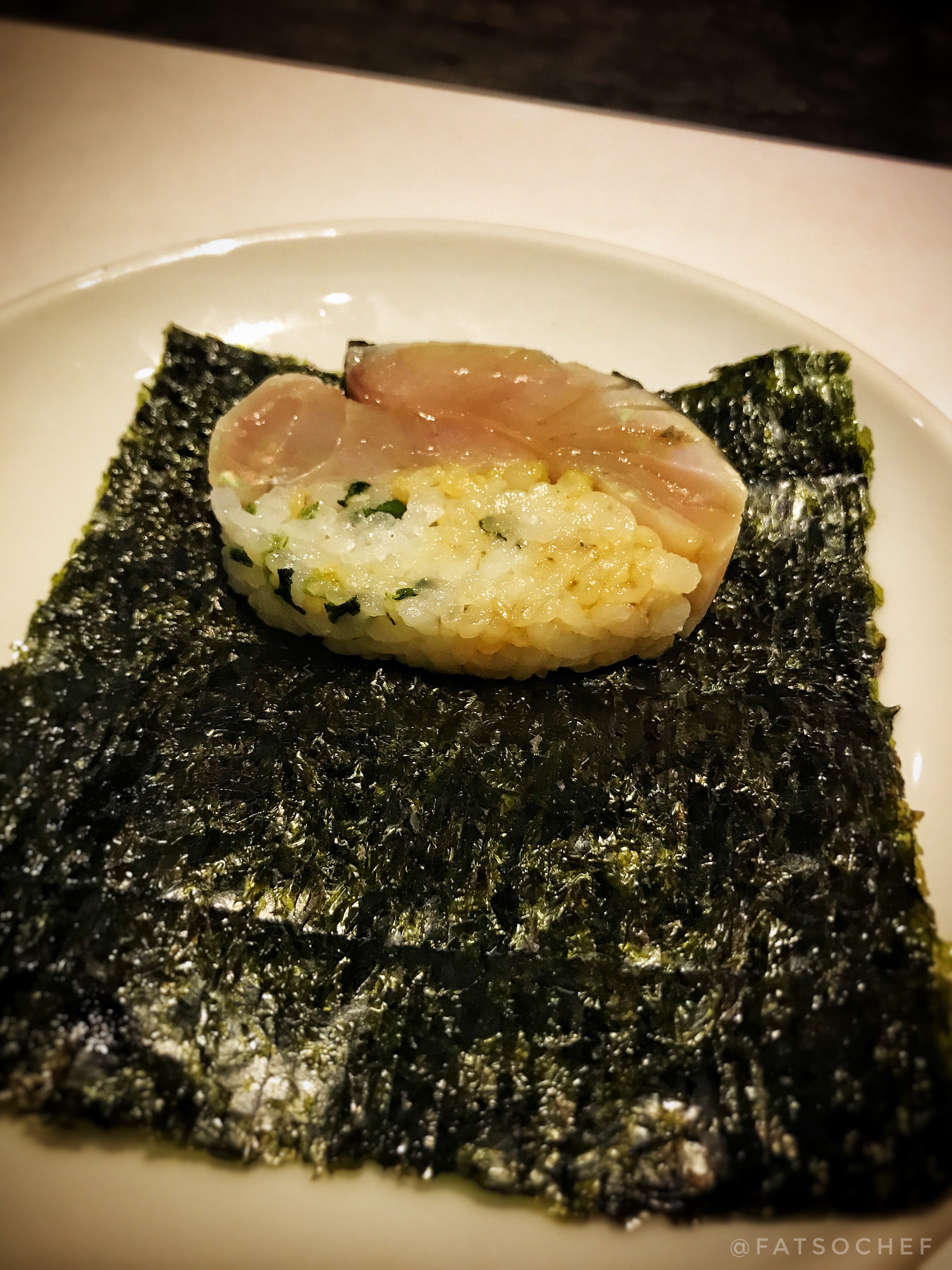 An Otoshi (S$5) of an open-face sushi to commence our meal. I popped it into my mouth before finding out what fish it was. Whatever it was, it sure tasted yummy; brushed with fragrant shoyu and accompanied by scallion dusted rice on a crisp seaweed. We’re off to a good start.