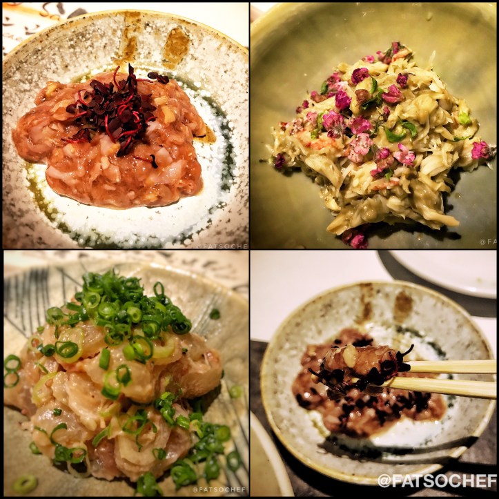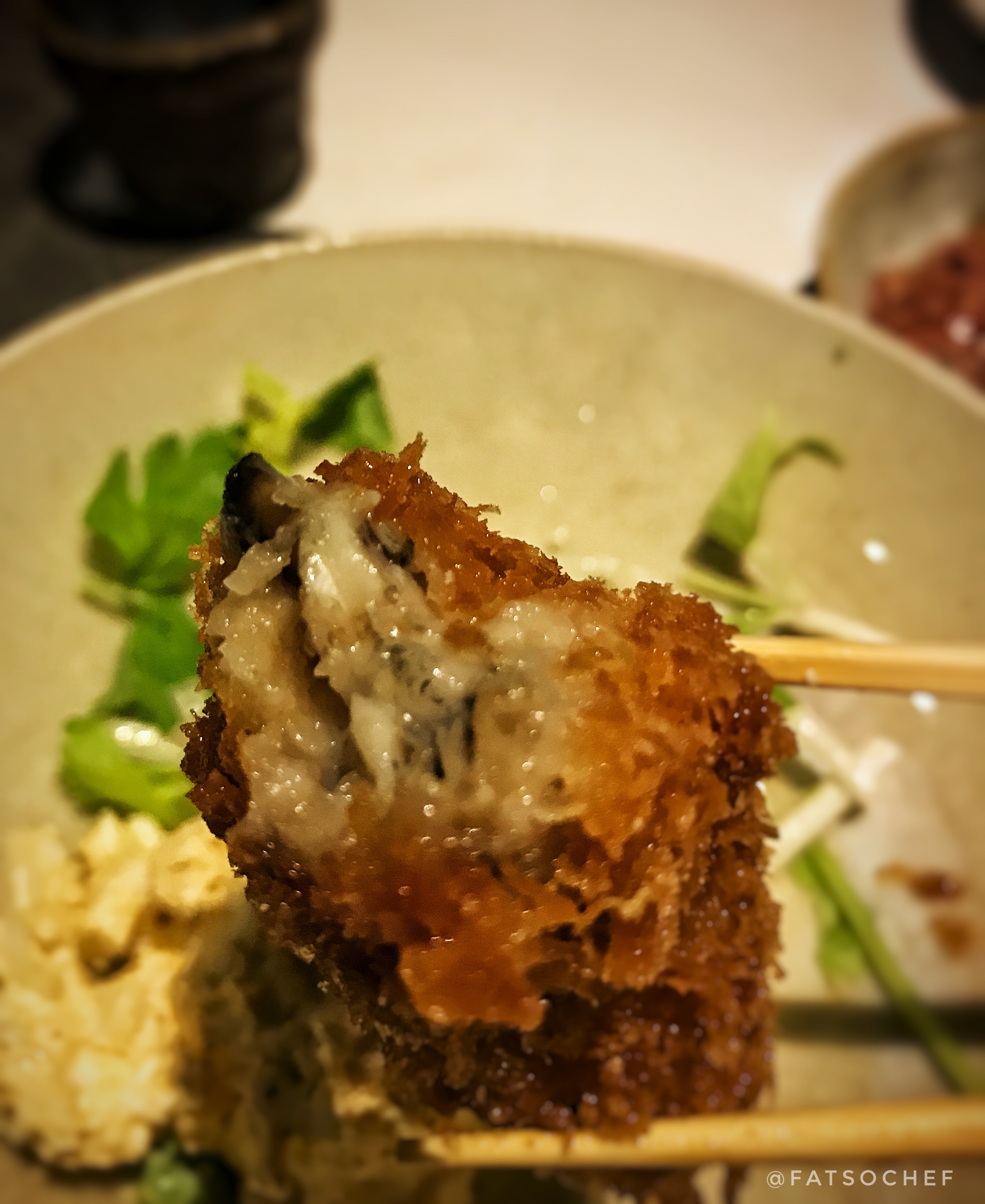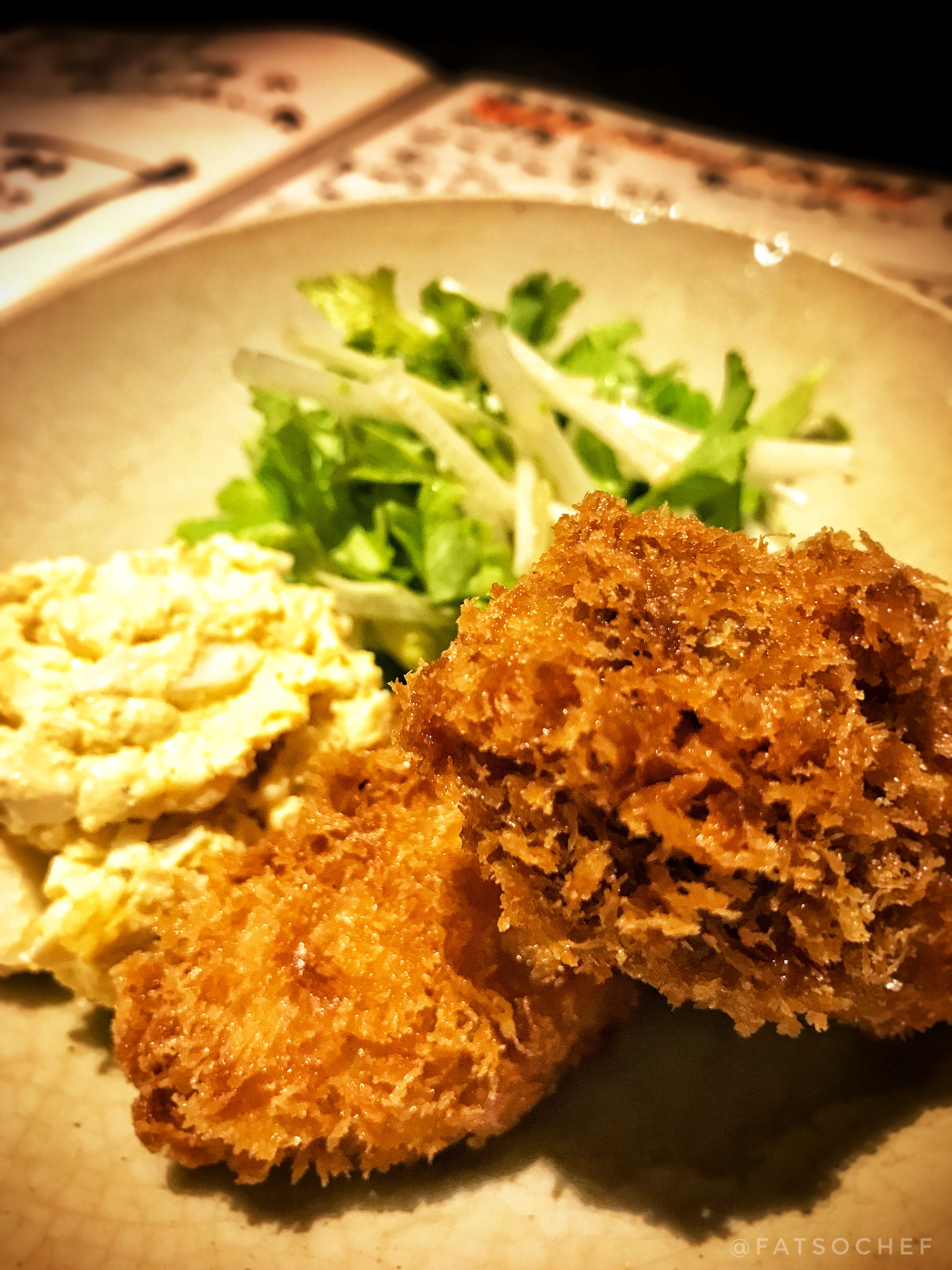Oysters from Hiroshima.- Personally, I much preferred oysters fried to raw. I like the contrast between the hot crust and the cool oyster. These were so fresh and delicious! And so plump and juicy. It totally nailed the contrast in taste and texture that I aim for. I was determined for another round if we haven’t another 8 dishes in line!