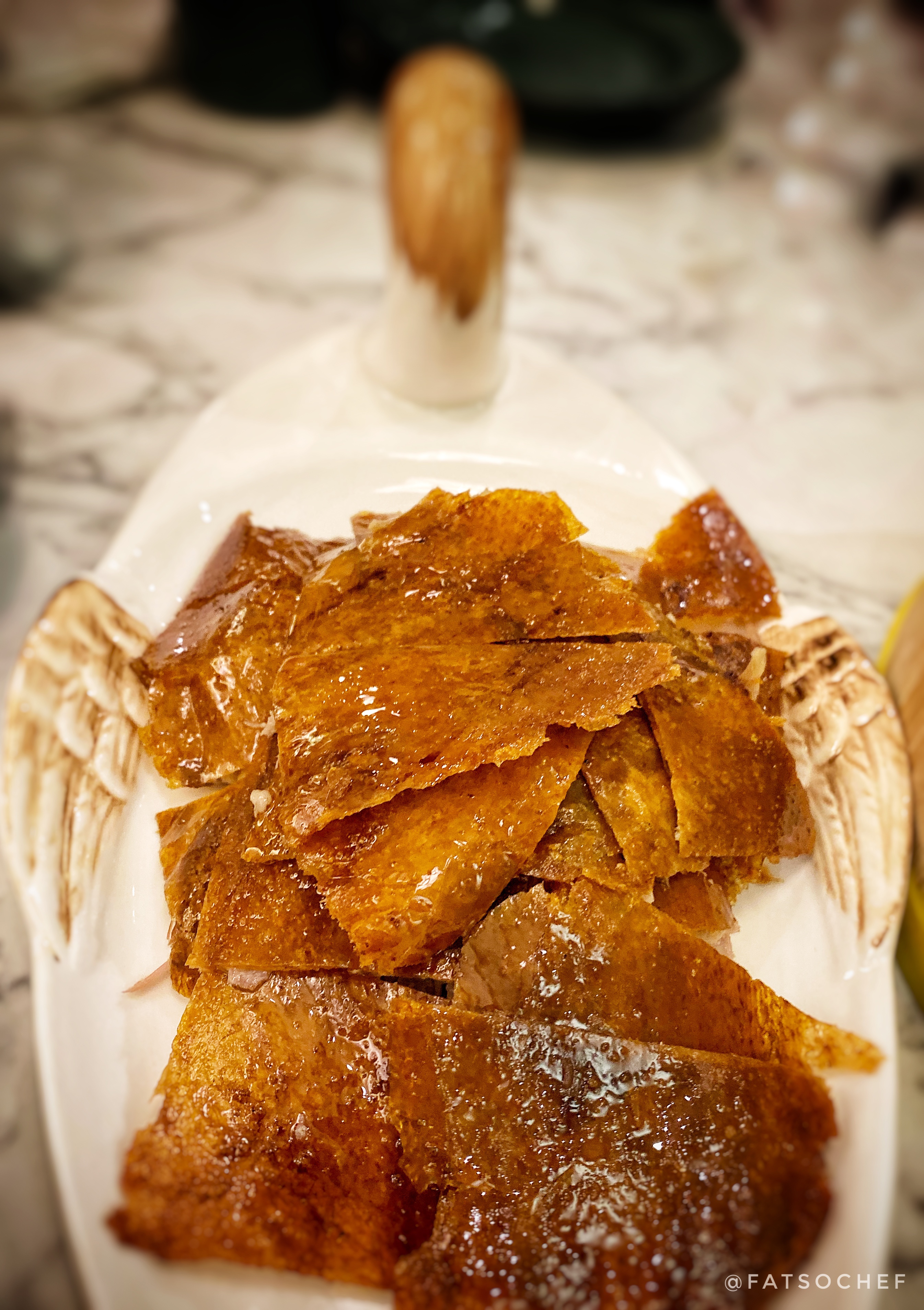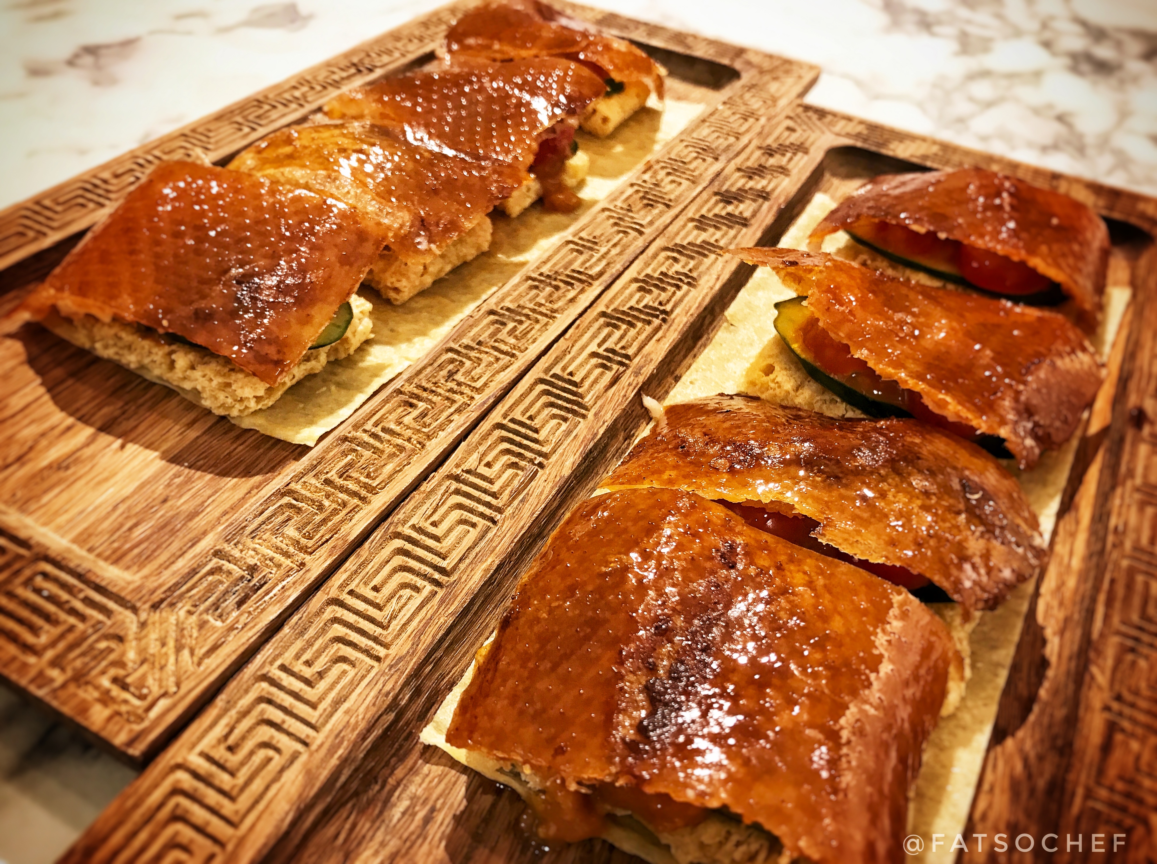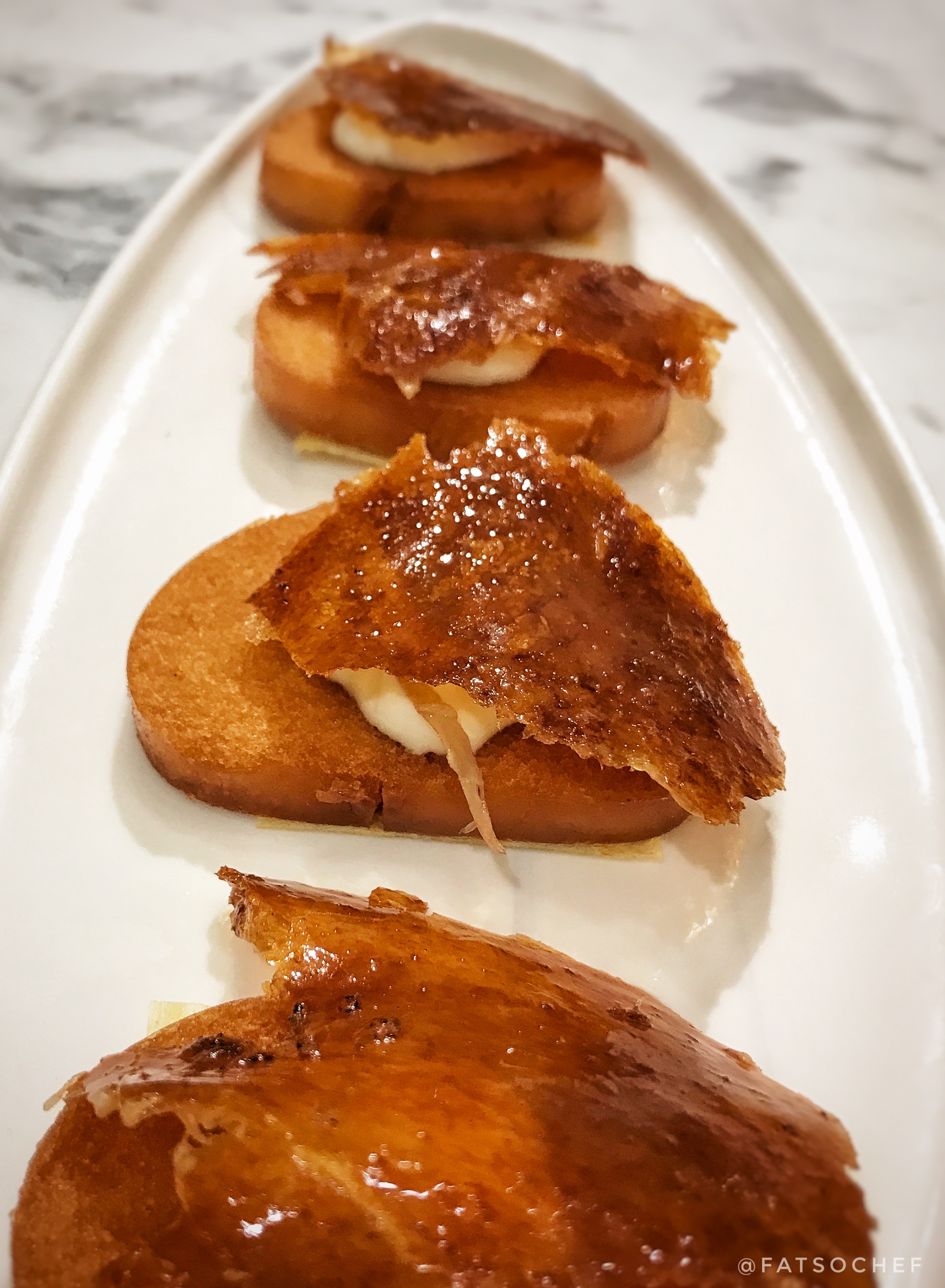 Crispy Bun with Sliced Peking Duck– Never thought I’d catch these two together! Creamy cheese and Peking duck skin on an open-face crispy sandwich.