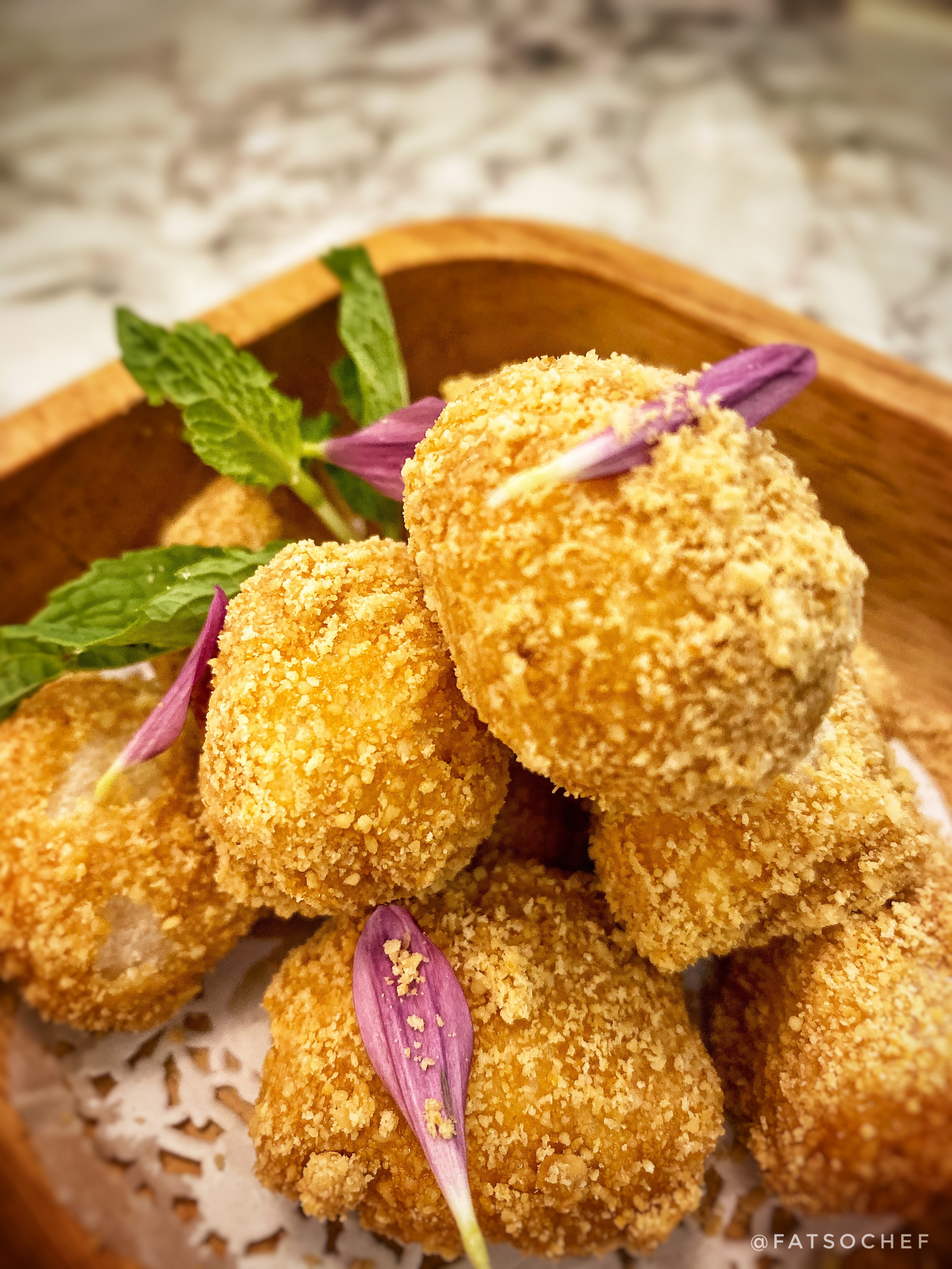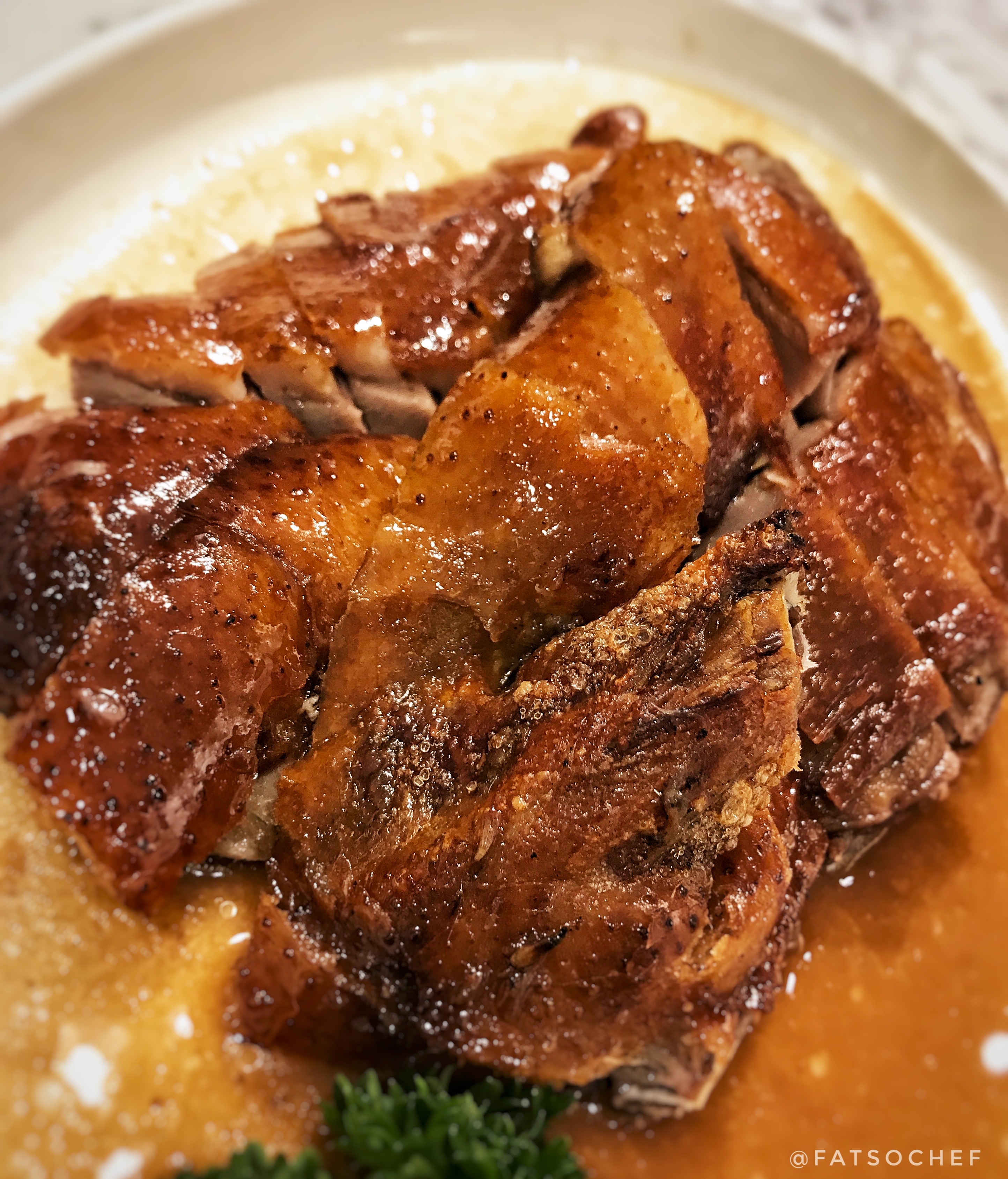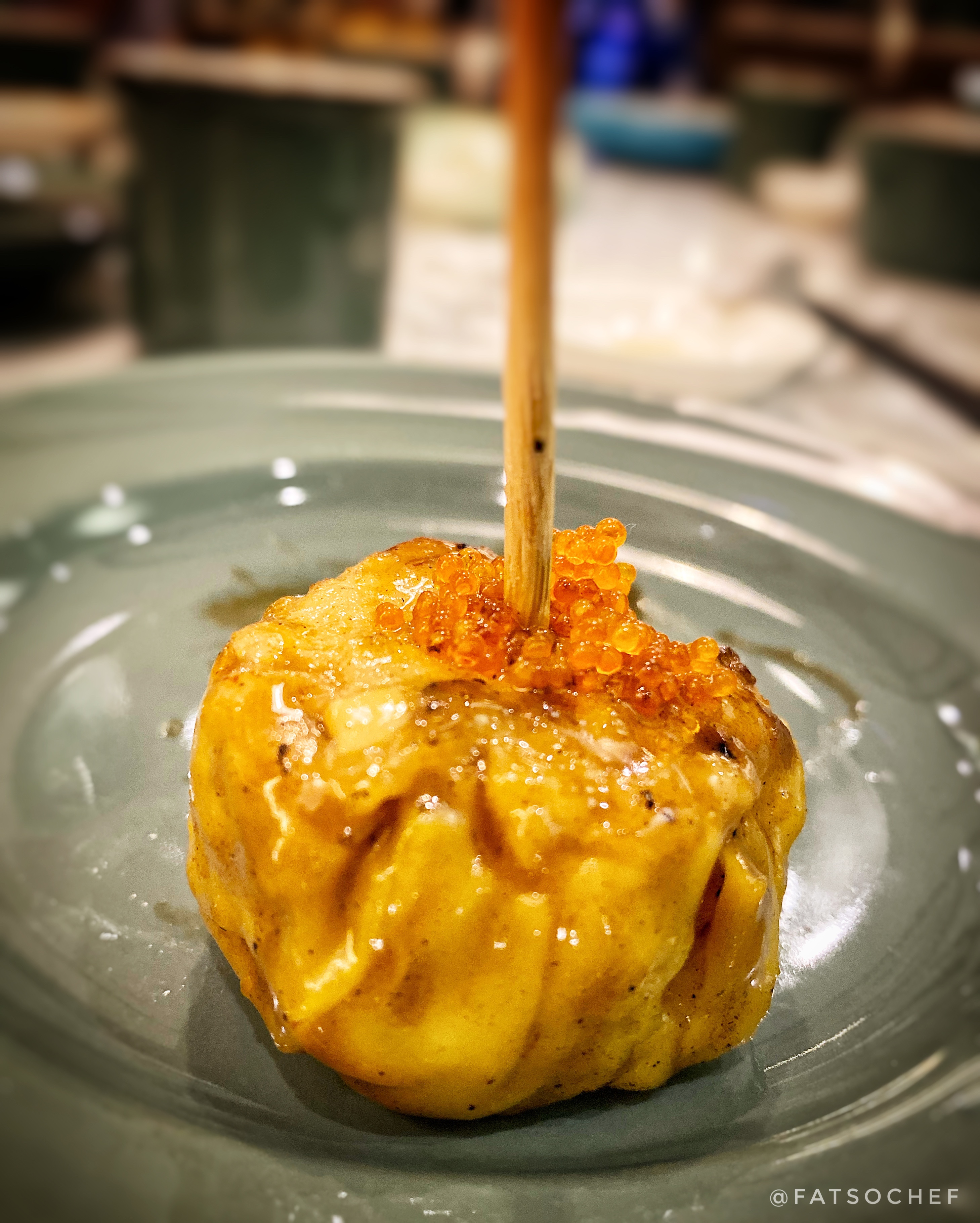 Crispy Bun with Sliced Peking Duck– Never thought I’d catch these two together! Creamy cheese and Peking duck skin on an open-face crispy sandwich.