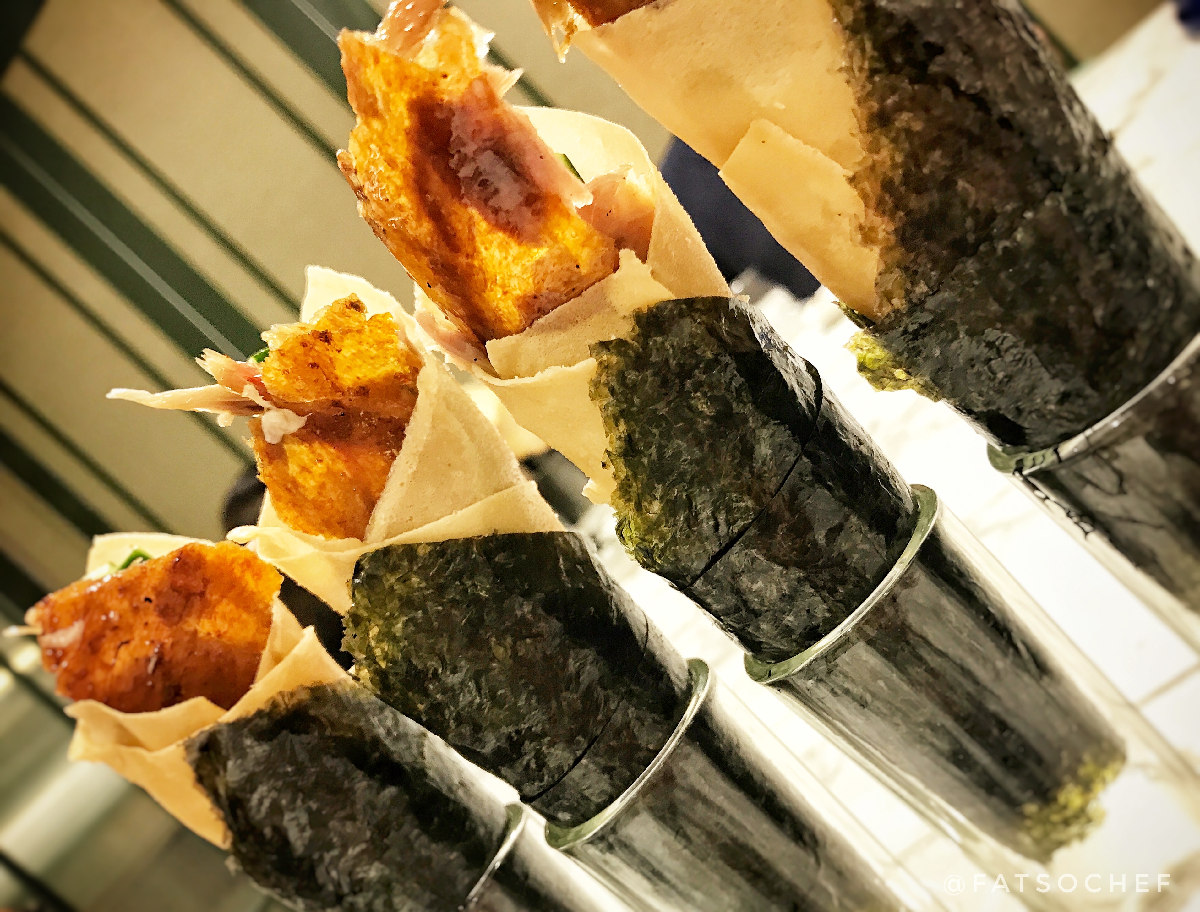 Peking Duck Salad Hand Roll– Duck skin, meat and cucumber sit snugly within a super crispy spring roll wrap and chewy umami seaweed. It’s one delightful crunchy bite after another, every mouthful filled with smokey duck skin and cool cucumber.