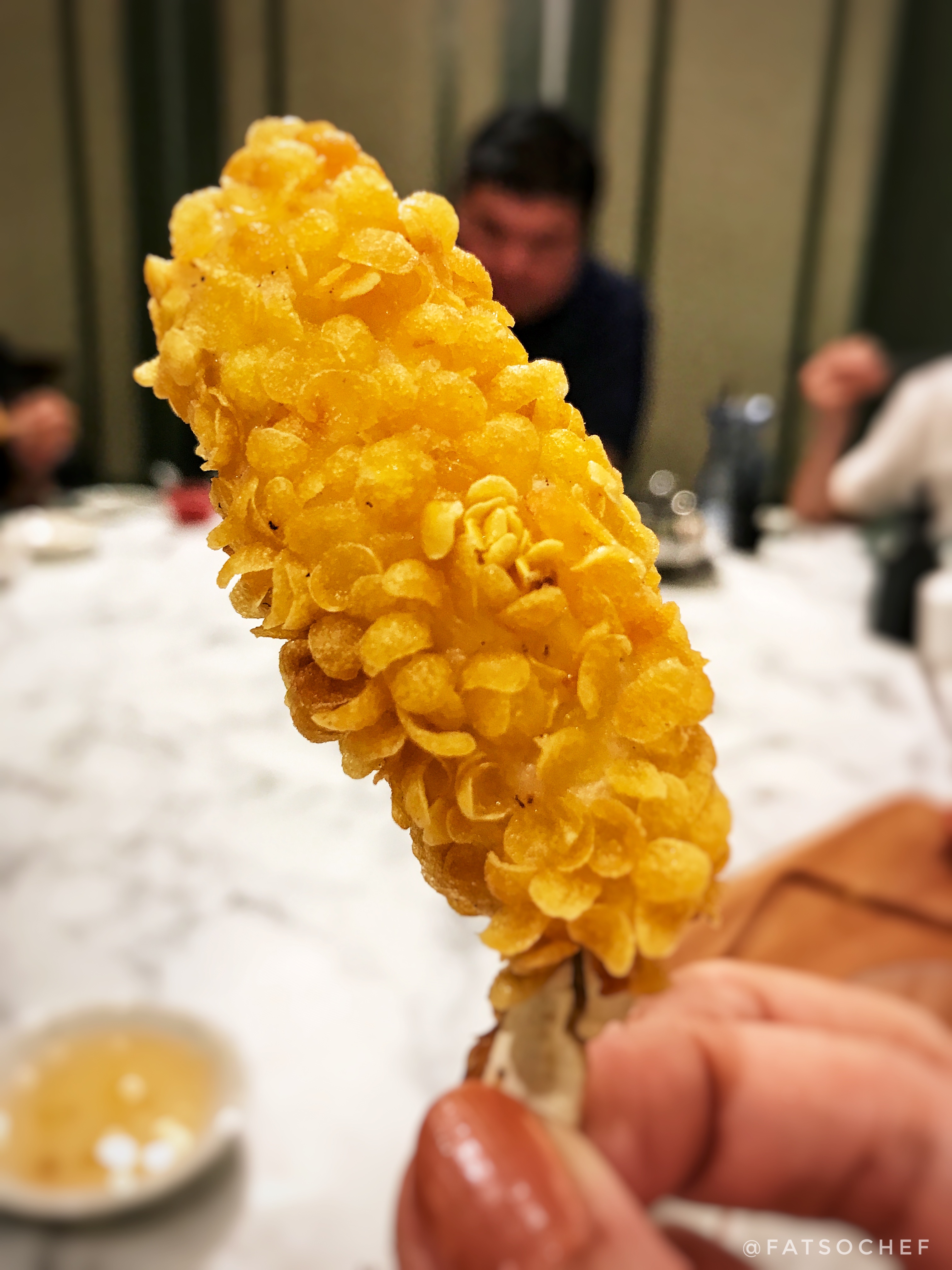 The signature Peking Roast Duck, made with Irish bird, promises crispy skin and tender meat. Our friendly chef carved the duck table side with expert strokes, removing excess fats while he’s at it. A first portion of crisp duck skins is served with white sugar crystals, reminding me of the way we ate it in Beijing. I had forgotten how much I enjoyed this style of eating it. If you haven’t Just dab a bit of sugar onto the skin to enjoy crunch over crunch, sweet over salty. A second serving included both duck skin and slices of duck meat. This, you eat it the traditional way, rolled up in a flour crepe together with cucumber, spring onion strips and sweet sauce. If you’re not familiar with adding duck meat to your Peking duck wraps, try it. It gives extra texture and bite and is more satisfying than just skin and crepe. Oh and don’t forget Kai’s signature corn crisps! They’re simply amazing!