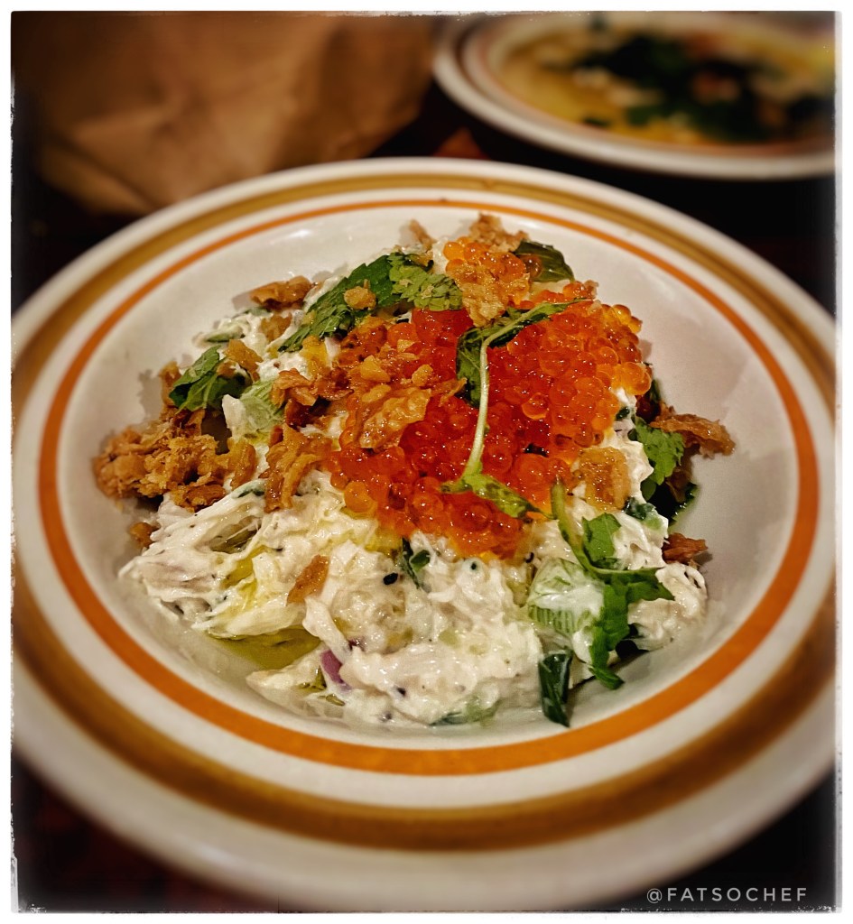 In the Crab Tzatziki, shreds of sweet juicy crab meat swim in a creamy, yoghurty dressing; befriended by bits of crispy chicken skin (Whoo-hoo!!!) and juicy Ikura roe. My God, this was so, so good, I could eat it on its own with a big old spoon!!