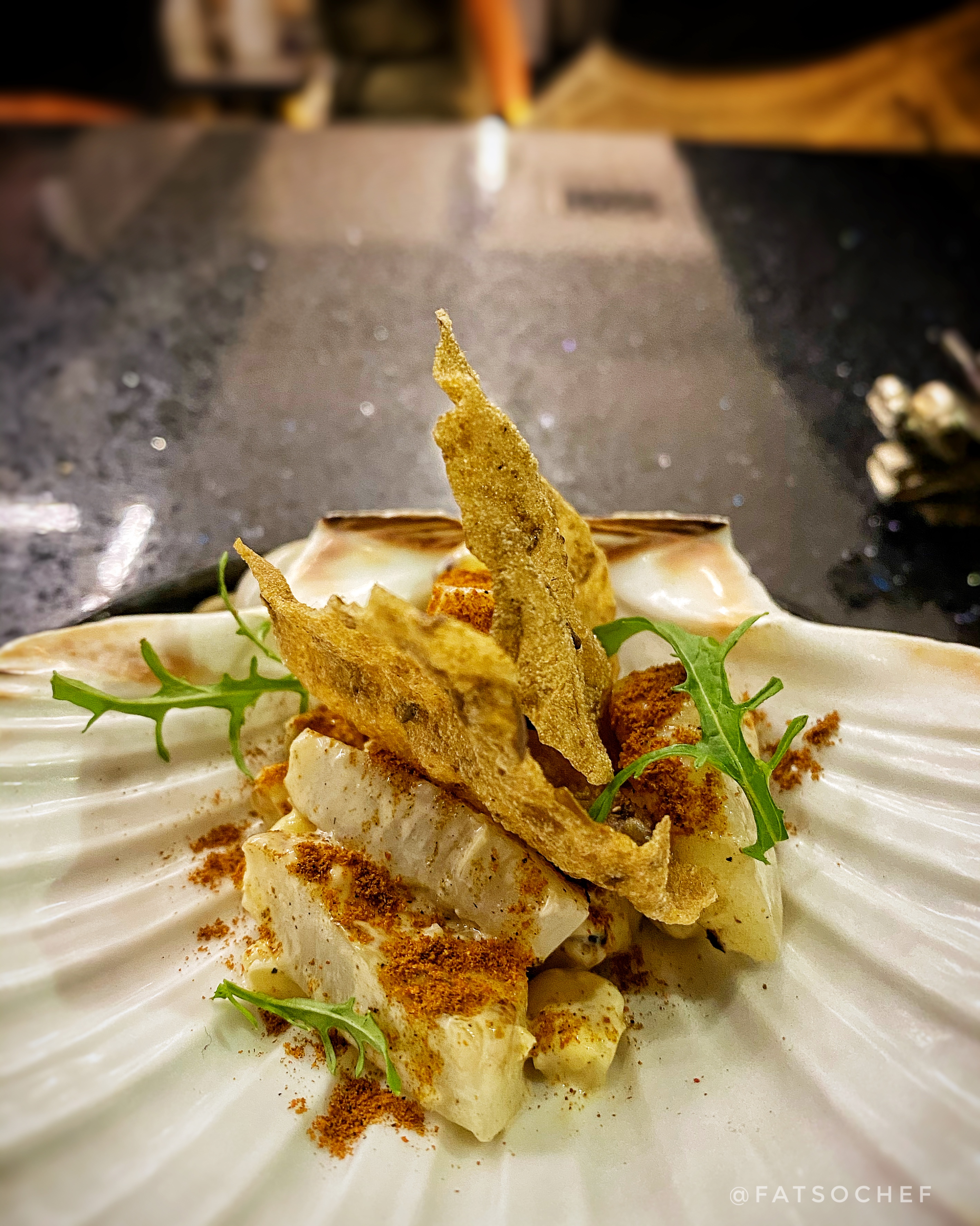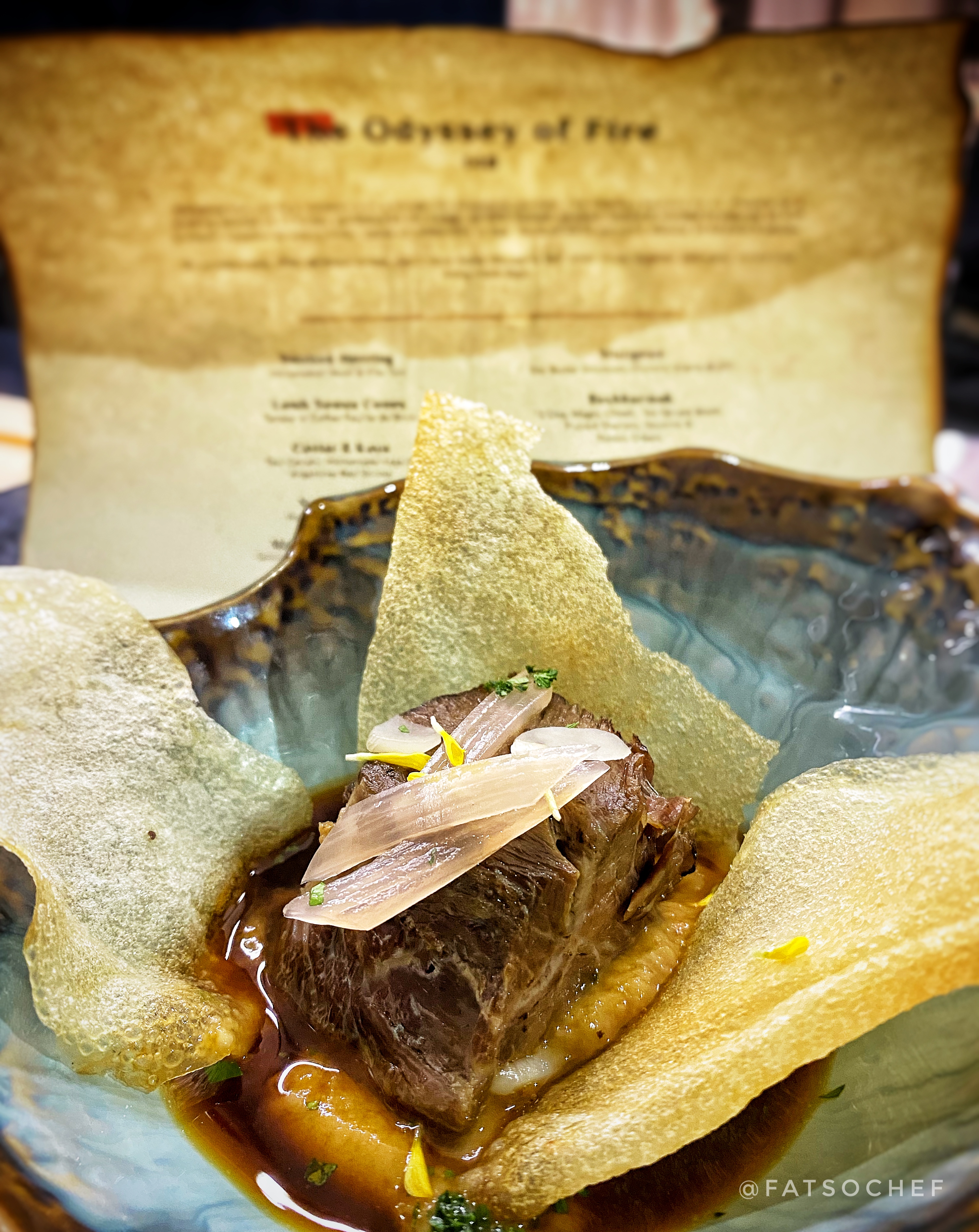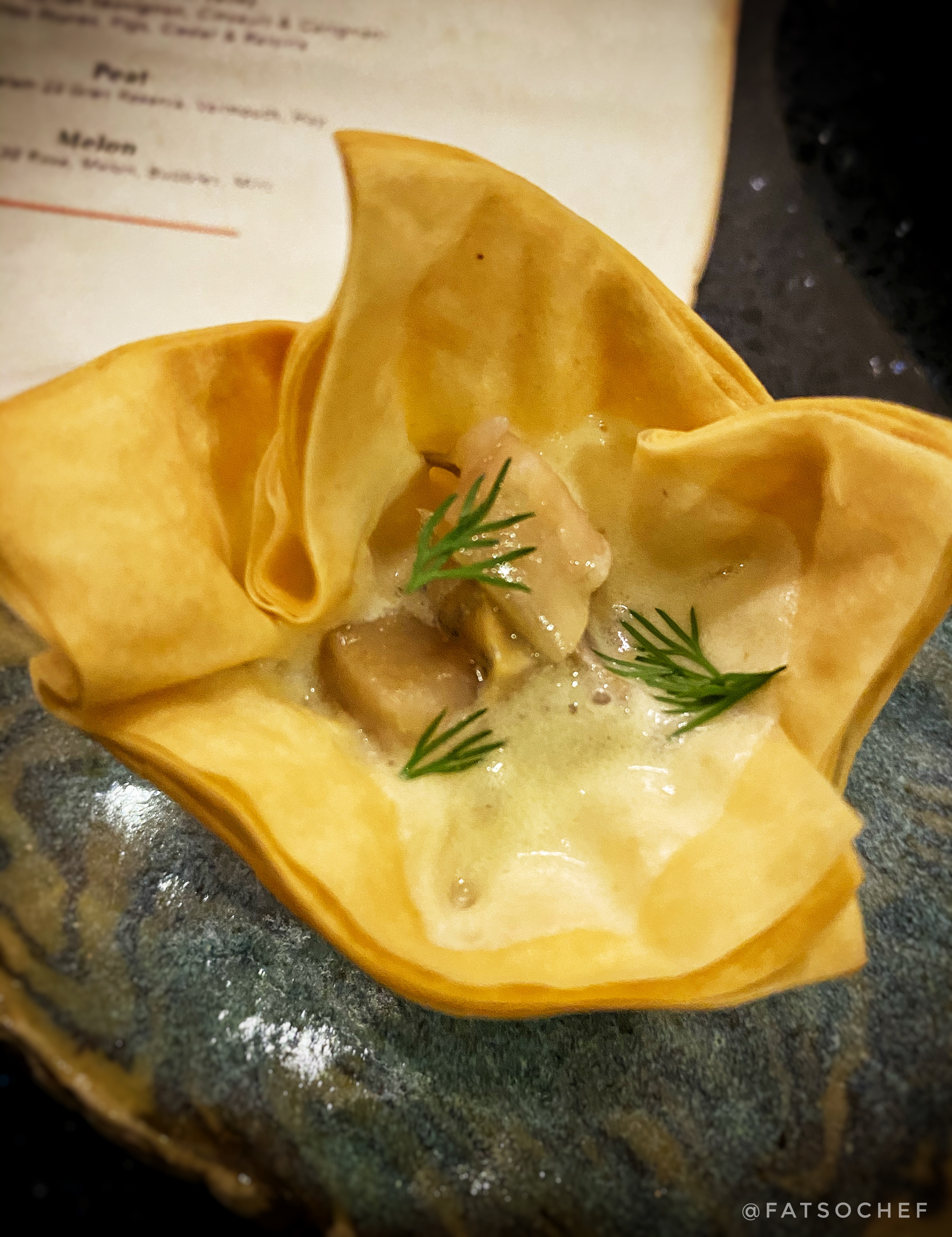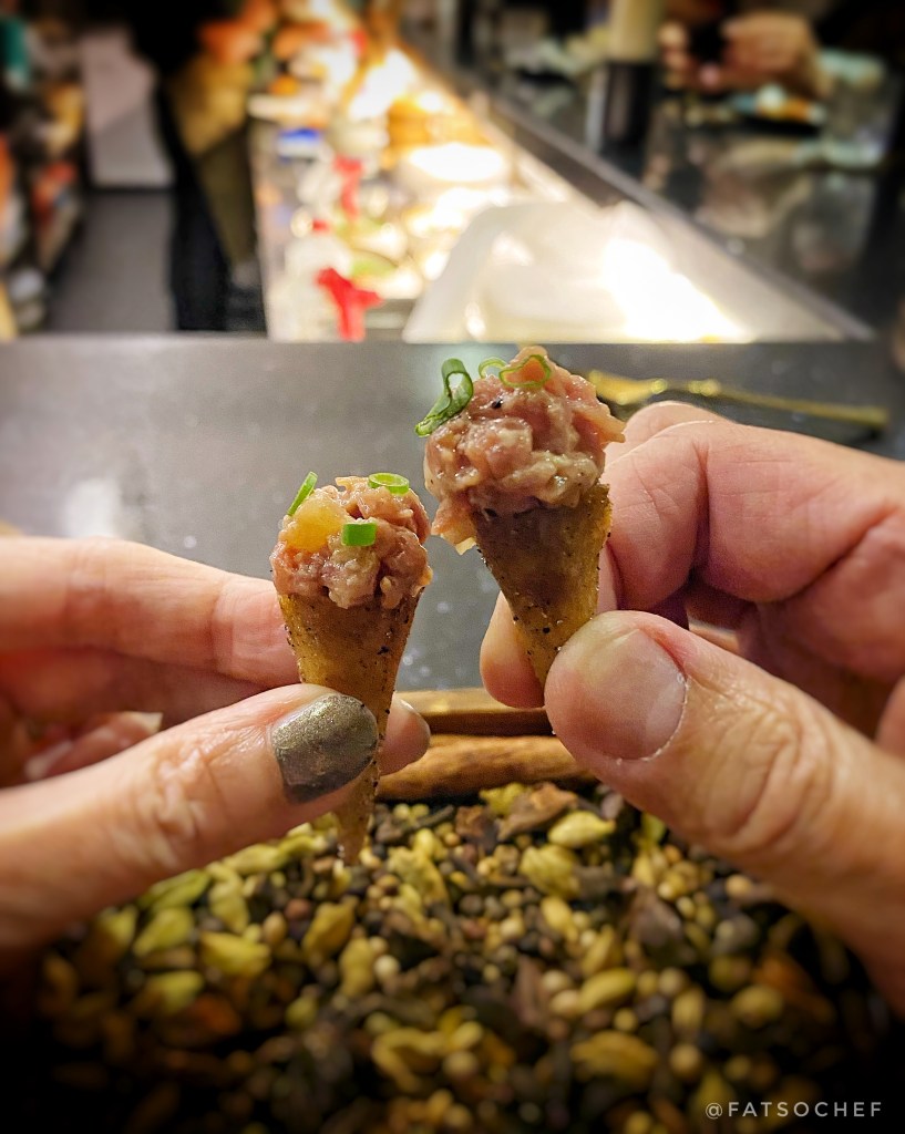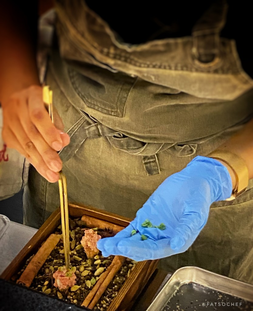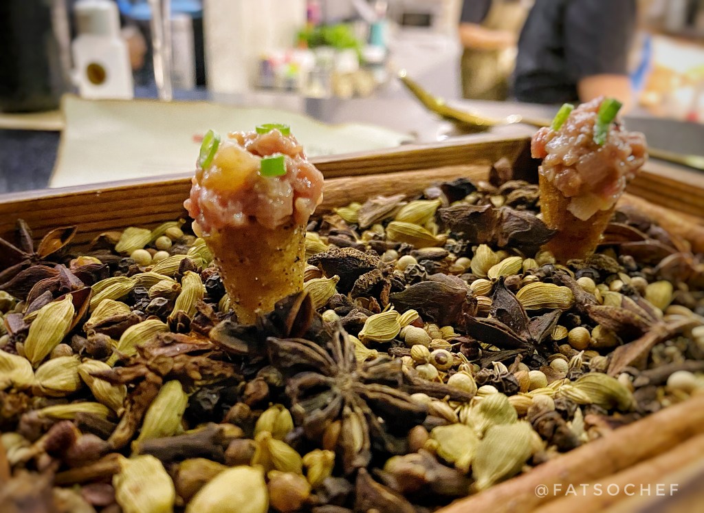 Lamb Samsa Cones – Lamb lovers rejoice! This mini lamb tartare “ice cream” plopped on a coffee cone, and served in a spice box planter, is a flavor bomb. While most people are turned off by lamb meat’s wild gamey scent and taste, I kinda embrace the those exact “flaws” (well… until it gets vulgarly unbearable!). But this little ball of lamb tartare was pretty flawless! The rawness of the meat is mild. I could not make out any extra marinade yet can’t imagine there was none. Pop it in your mouth and the combo melds like the perfect marriage. Enjoyed this little one very much!