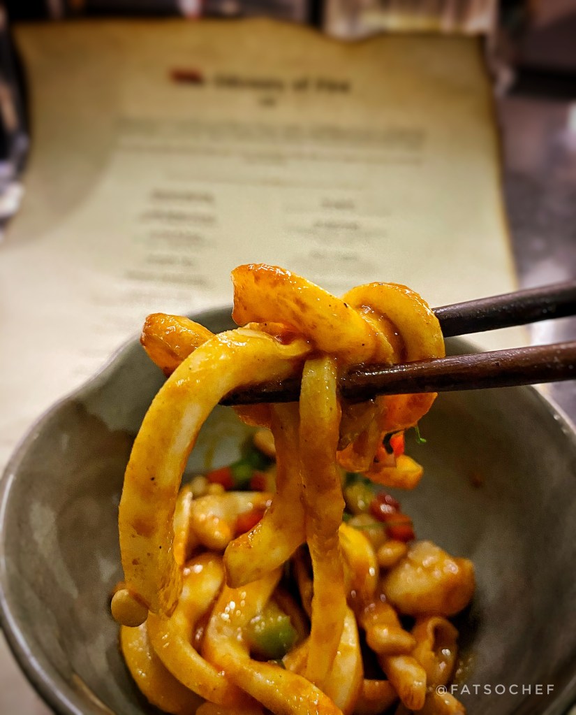 Squid Laghman– The chef kindly whipped up a non spicy version of this Szechuan spiced squid dish as I do not take spicy food. Tender squid cut into thick noodle-like strands and dressed in a sweetish dressing with bits of crunchy pine nuts and capsicum. Though the squid noodles were nicely cooked to a tender bite, the flavor felt a little plain tomato-ish to me. In this case, I reckon the spicy version might have been better.