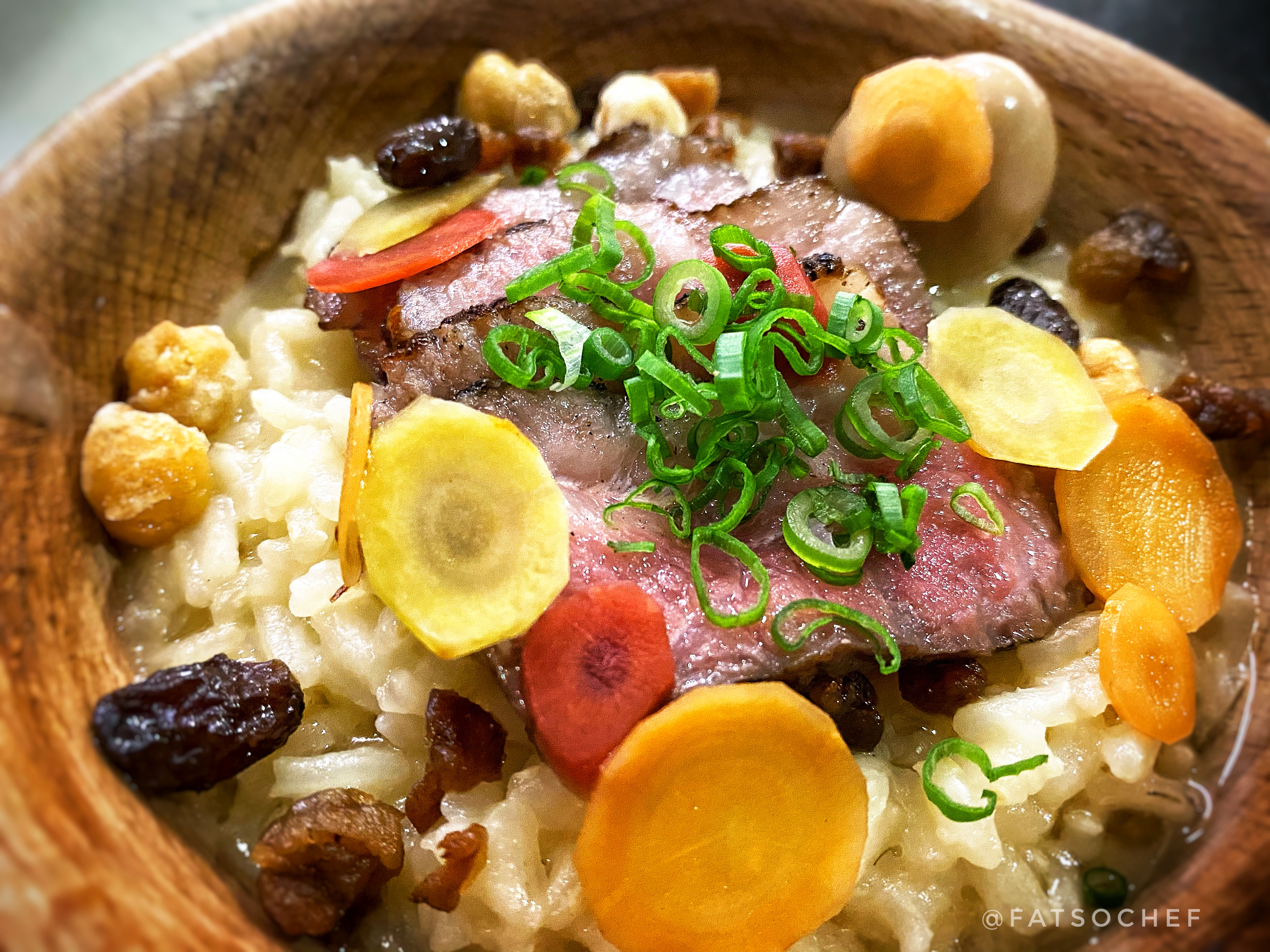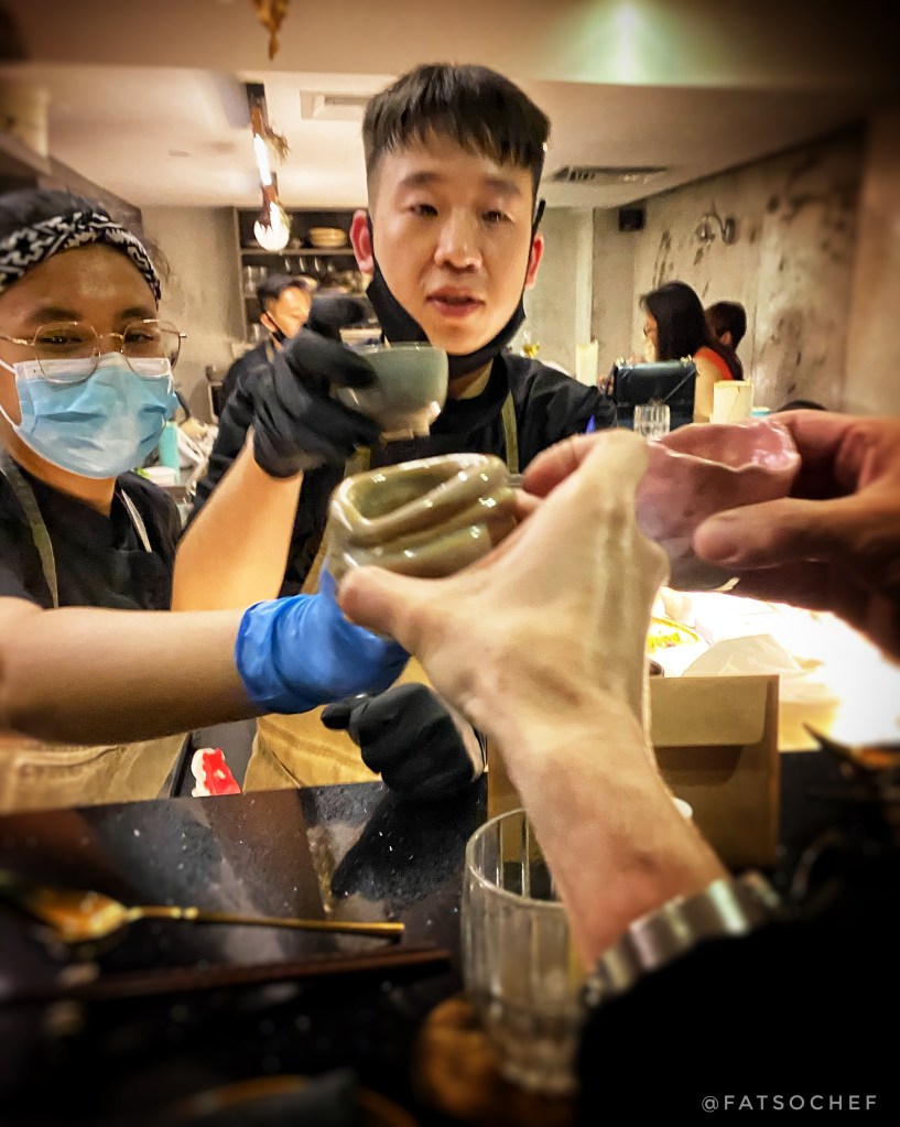 Hunter’s Plov– By now (dish number 15), I am wishing I hadn’t eaten all that bread and butter; and was quite willing to skip the final rice entree. I mean.., who needs carbs?! But when Hunter’s Plov was set before me, I knew I was doomed! To start with, I am a closet carb junkie!! A subtle aroma whiffed pass my nose. The pink Wagyu stared temptingly at me. And the whole dish just looked absolutely handsome and tempting! One mouthful, I thought to myself… sigh… didn’t happen. Cleaned out the entire bowl! Beautifully cooked…, every grain of rice is infused in clear savory broth. I love the addition of sweet raisins, tender carrots and crunchy chickpeas. The Wagyu, though a high A4, wasn’t as buttery as I’d expected but still good. And a bonus treat, the tea smoked quail egg with runny yoke! Don’t know anyone who doesn’t like a runny egg. Very, very comforting rice dish to finish. And of course, very yummy.