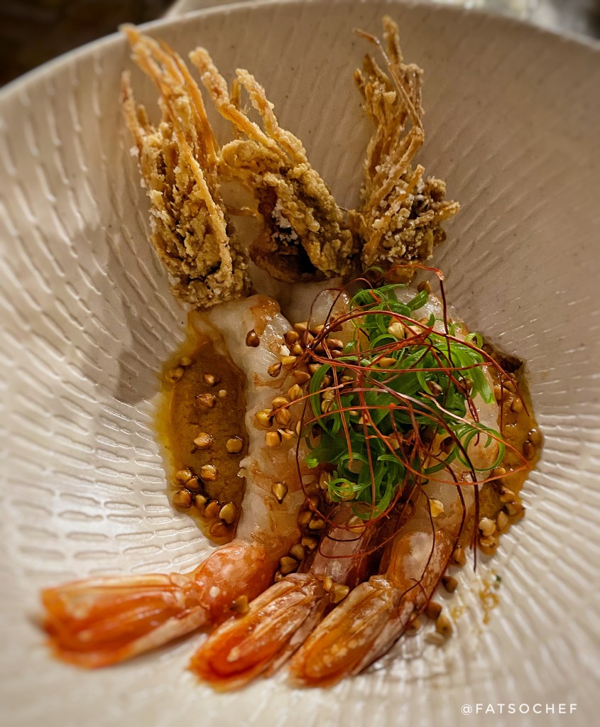 It was a close fight between the Cold Truffle Scallops Glass Noodles and the Deep Sea Argentinean Prawns; but the latter won with no regrets whatsoever. The Ménage à trois of delicate prawns arrive neatly pressed against each other, the fried prawn heads looking very promising! Of course we couldn’t wait to bite into them and of course they delivered beyond our expectations. Perfectly seasoned and fried to a beautiful crunch, texture and color, yet without the slightest bitterness and greasiness that sometimes accompany deep fried foods. T’was a good head start! The shelled prawns were quick-dipped in a blend of warm garlic oil and lobster emulsion, giving the meat just a hint of aroma. It looked and tasted almost raw to me, but according to the chef, it is a good 70% cooked! I’m still trying to grasp that as I relive it now! Anyhow, cooked or not, it was an incredible prawn. Sweet and meltingly smooth in the mouth, with soft flavor from the creamy oil just caressing the meat. This was Perfect!