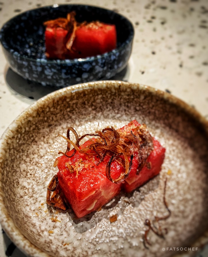 Before your meal begins, you’re served an amuse bouche of watermelon cubes with fried shallot ringlets. No doubt simple, but a nice touch and the juicy fruit was thirst quenching-ly appropriate for our hot weather. Also worth mentioning, the Classic Thai Ice Tea… One word- authentic!