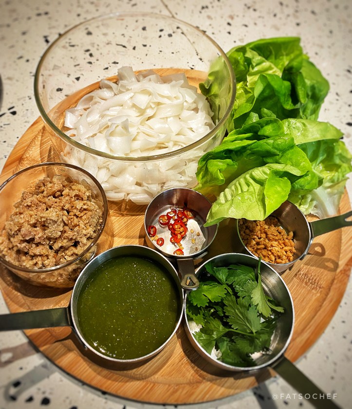 Wrap It Up. As the name applies, you’re presented with a platter of condiments including sauteed minced pork, flat rice noodles, crushed peanuts, coriander and chopped birds eye chili to be wrapped up in crisp butterhead lettuce and enjoyed with a mildly spicy homemade sauce. To be honest, it didn’t look very exciting aesthetically. The pork looked pale, the rice noodles looked pale, and save for the bits of red chili and brown crushed nuts, everything else was just green, green and green. As guided, we mixed everything in with the rice noodles, gave that a good toss before spooning some onto a lettuce leaf. I un-enthusiastically took a bite and to my surprise, it tasted no where near pale! As a matter of fact, the pork was well seasoned, tender and moist, flavoring the noodles very nicely. The coriander adds a little chivey zing and some toasty, crunchy peanuts always hits the spot. The sauce was indeed mildly spicy but packed quite a punch nonetheless. I had to request for a 100% un-spicy substitute, which the kitchen whipped up in a jiffy. My new dip, a limey savory one, gave the wrap a clean, fresh taste which was totally appetizing, I could not stop rolling wrap after wrap! I would love extra crushed peanuts, as that would elevate the crunch pleasure even more.