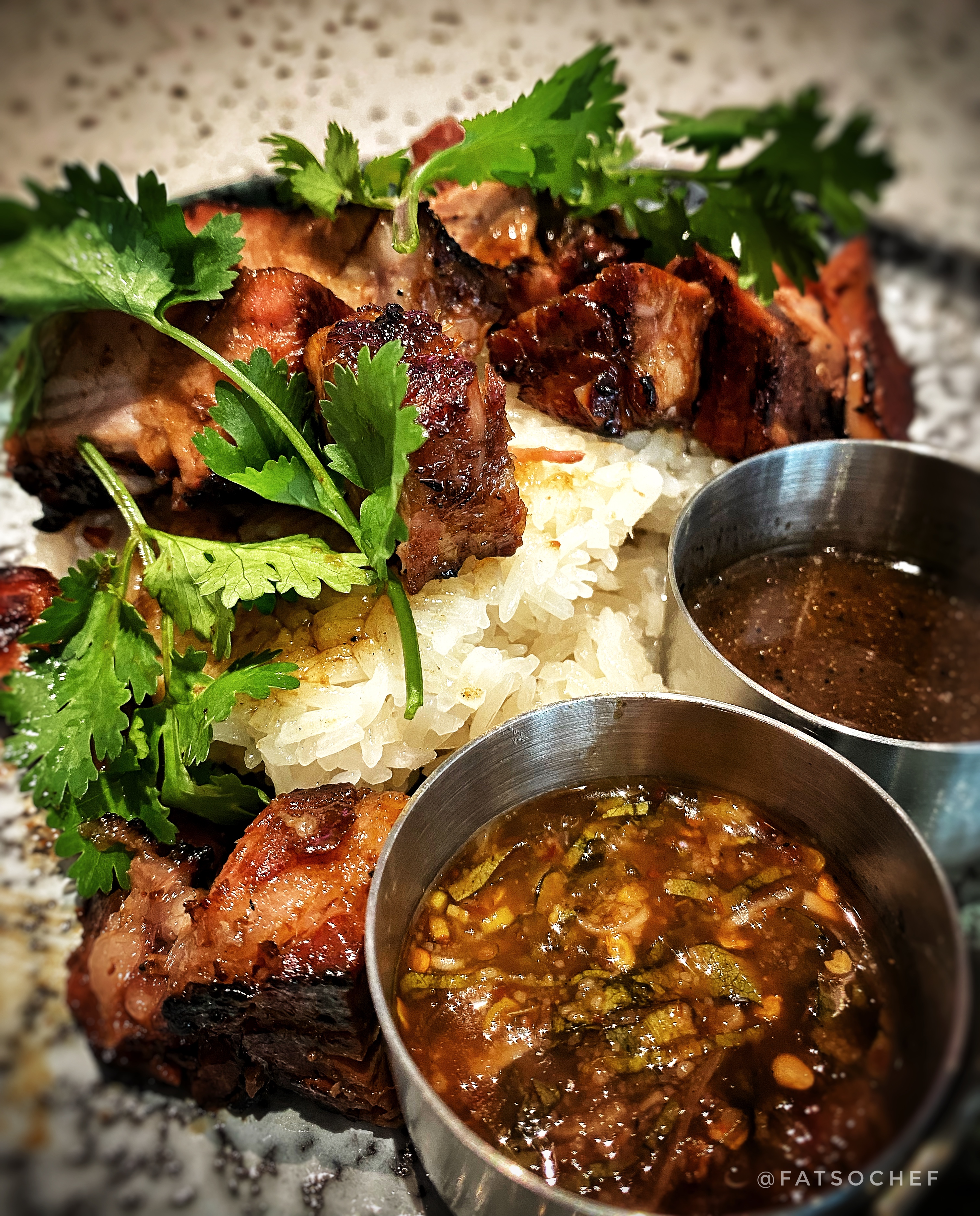Moocano comprises of sticky glutinous rice topped with grilled pork collar, served with a special dip. It was a big portion. Big chunks of grilled collar meat adorn glistening glutinous rice. It smelled terrific! We poured the accompanying shiny glaze over the pork and rice, tore up the meat and mixed everything up well. Some of the pork tore apart effortlessly while some took a bitta yanking. Maybe they’ll be fine between my teeth, I wished silently. This reminded me of a deconstructed Chinese rice dumpling (Bak Zhang) at first bite. It was sweet with a tinge of soy saltiness and subtle spice aromatics. That special dip? Was very special indeed. A little spicy and so deep in flavors. I’m guessing shallots, chili, garlic, lime in an umami fish sauce. It balances the heaviness of the rice, cuts the sweetness of the glaze and enhances the porky-ness of the meat. As filling as glutinous rice is, this was also unstoppable-y delish! As expected, not every piece of the pork was tender. Score a fattier piece and the meat melts nicely into the rice. Pick a lean one and you kinda get stringy, jerky-like meat. Pork collar is usually marbled with streaks of fat; so it puzzled me why there was quite a bit of dry, lean meat in there. So either braise it longer or QC the cut before cooking. Or, as suggested to young lad owner, try a fattier cut like belly or knuckle. Hmm… my mouth waters at the thought of that!