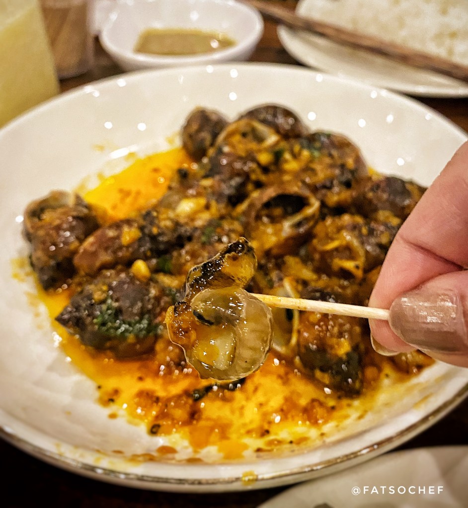 Fry Sweet Snail was a challenge to eat. We had to forgo etiquette and go in with our fingers. These little fellas were reasonably meaty for their tiny size and sautéing them up in butter, garlic, onions and spices was possibly the wisest choice! Crazy flavorful! The marriage of butter and garlic was the perfect foundation for the extra spices. The snails were cooked just nice so it stays tenderly chewy. The buttery sauce was so good; and like typical carb loving Asians, we ordered some rice to go with!