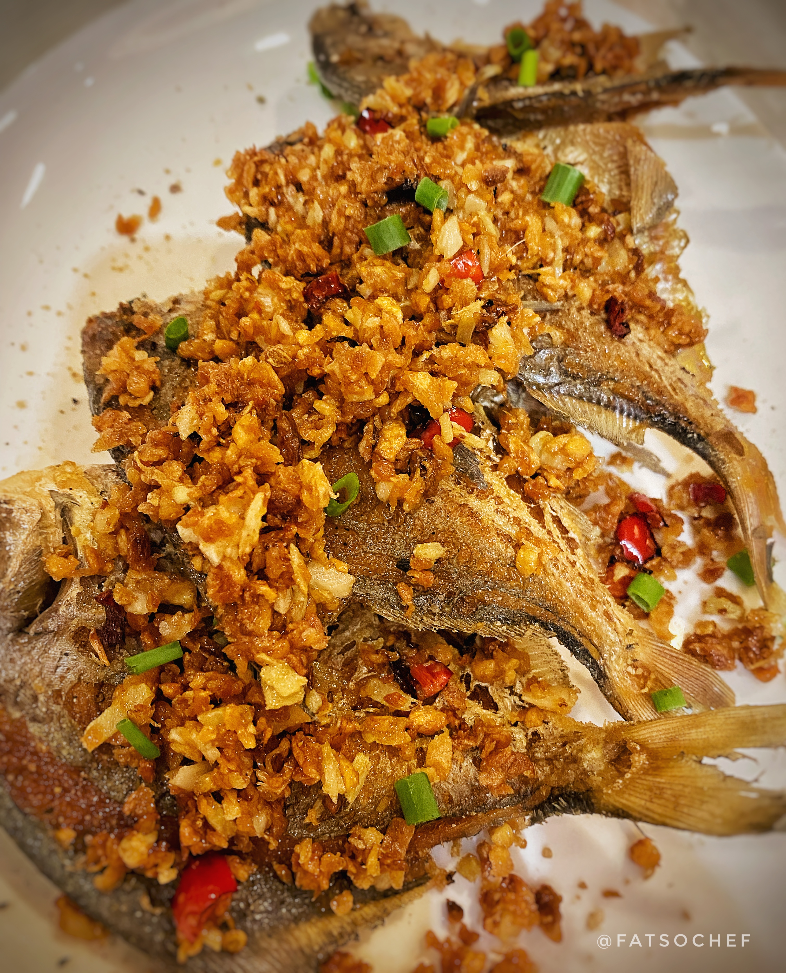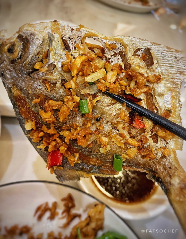 In the chiller where a variety of fresh catches are displayed, I spotted some Mini Pomfrets. There’s no other way to cook this. Deep fried to a crunch so perfect, we were able to eat every bone and fin and the entire head in sheer joy! Topped off with a mountain of crispy garlic chips for even more flavor and punch. These mini pomfrets don’t come by very often.. so make it a point to order some if available!
