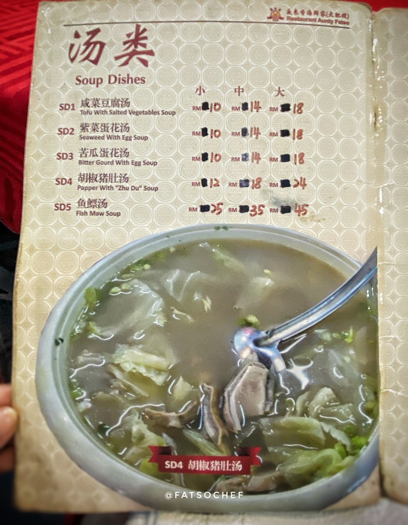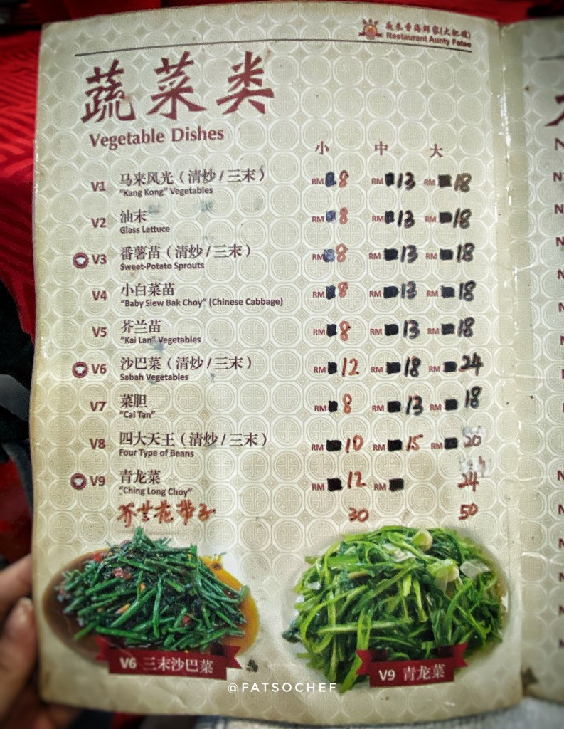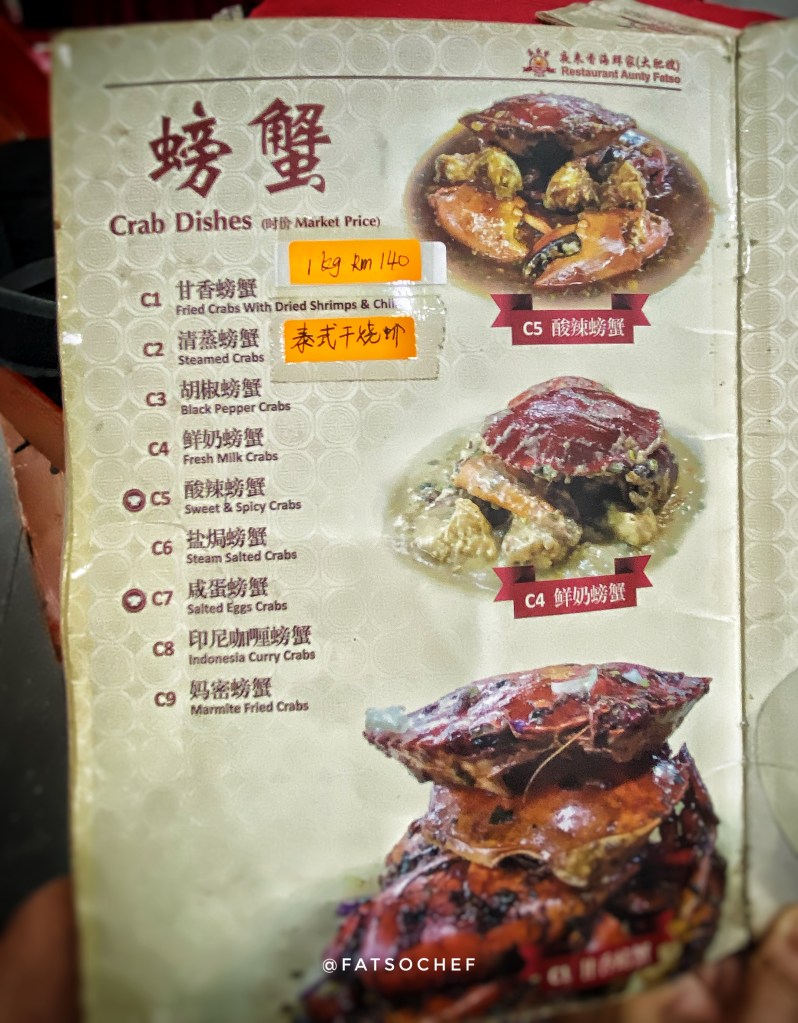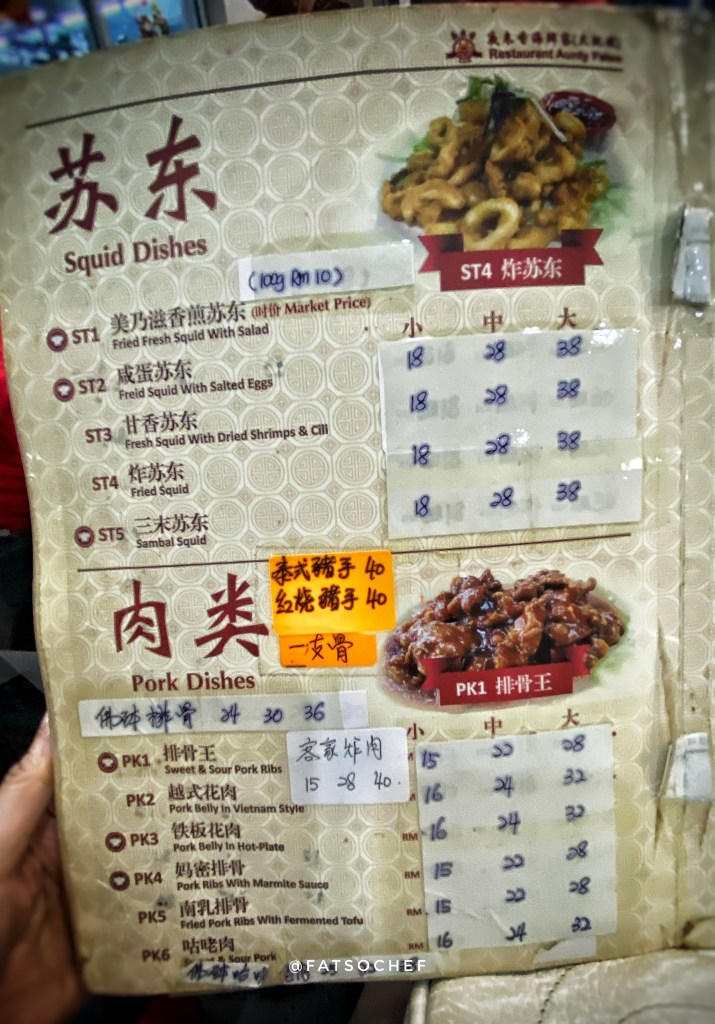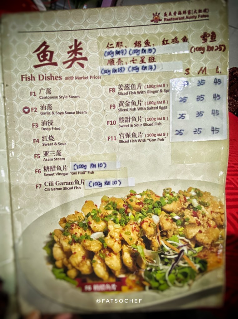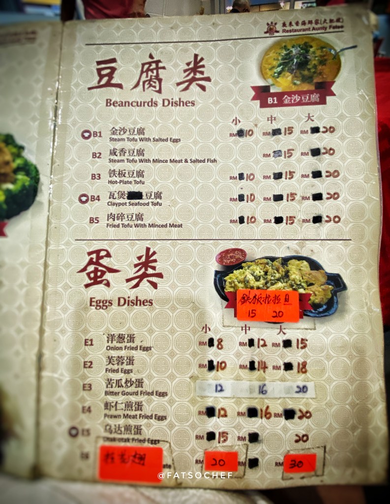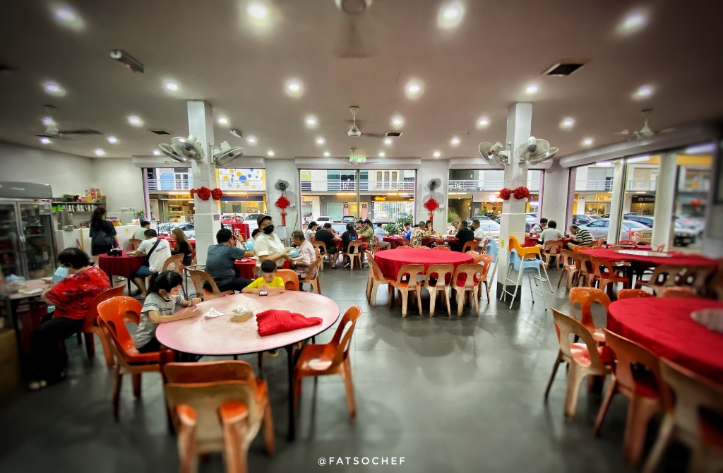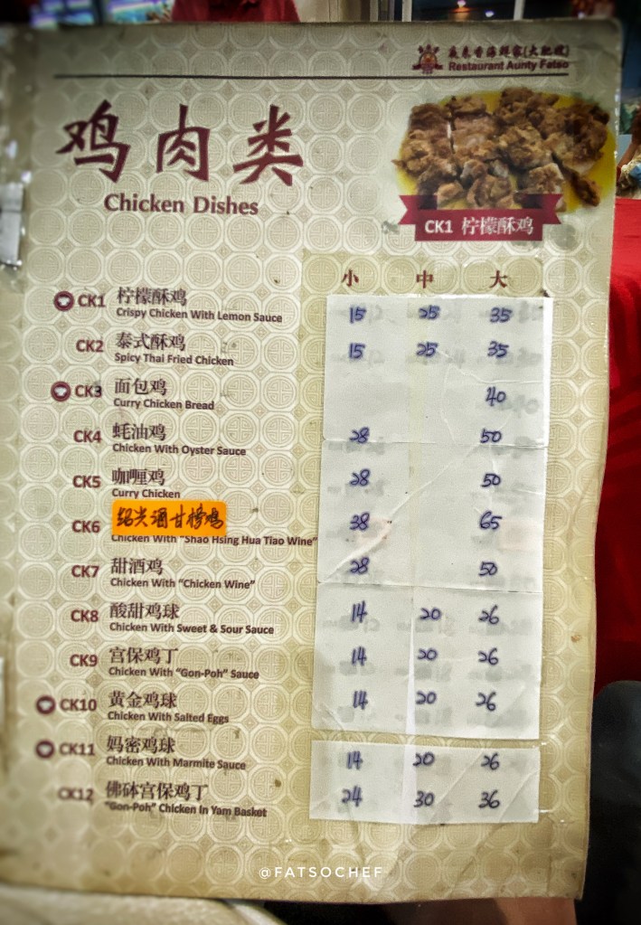 We arrived at Aunty Fatso’s as the crowd began to pack in. The brightly lit restaurant was decked in auspicious red tablecloths and red plastic chairs, typical of old school Chinese restaurants in Asia. There are 2 areas, the open concept main hall cooled by fans and an air condition room which sits a good 30-40 persons. We were lucky to score, albeit a table too big for the four of us, but nonetheless, one, in the air-condition hall. Service was efficient and swift. Moments after we sat down, a jolly lady plonked herself on an empty chair at our table! Aunty Fatso is in D’house, ladies and gentlemen!