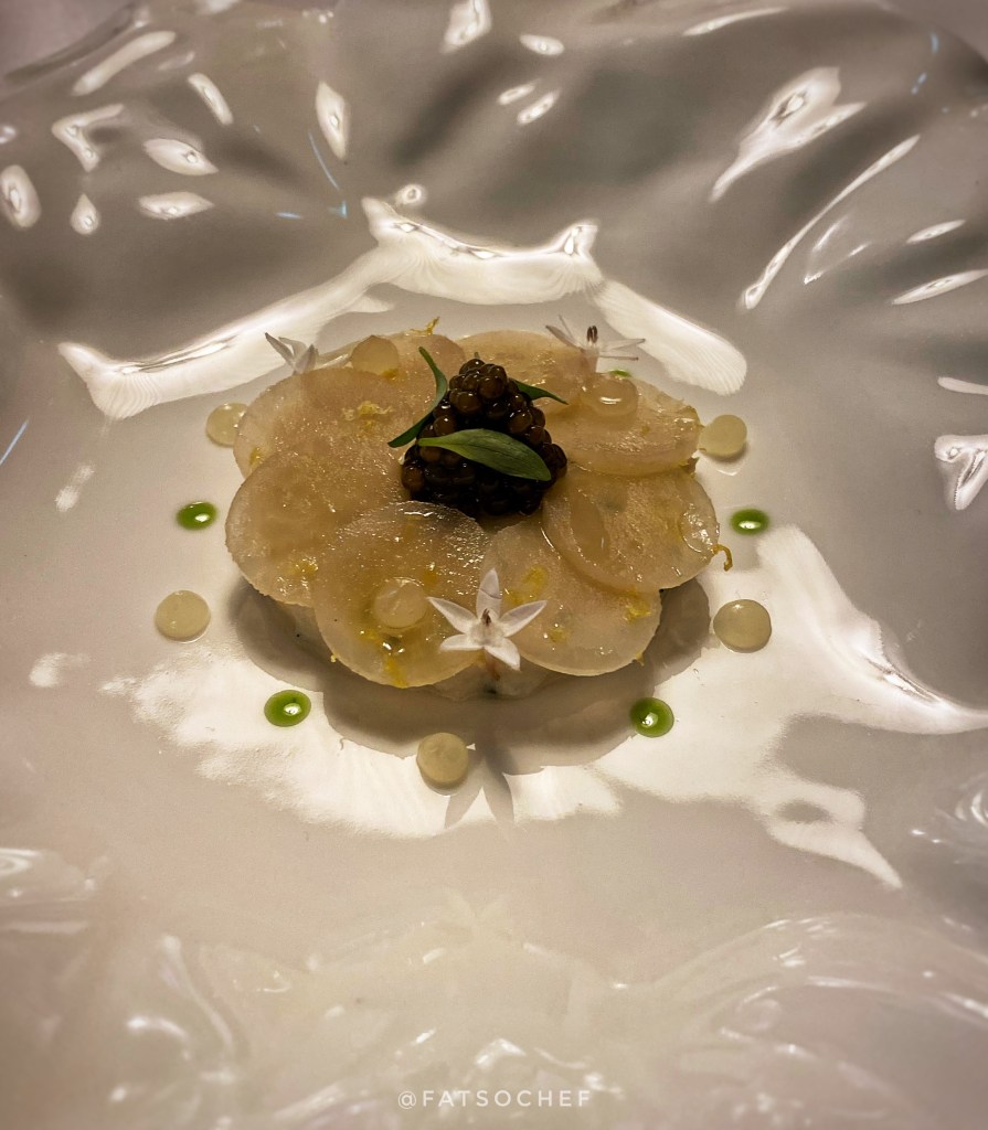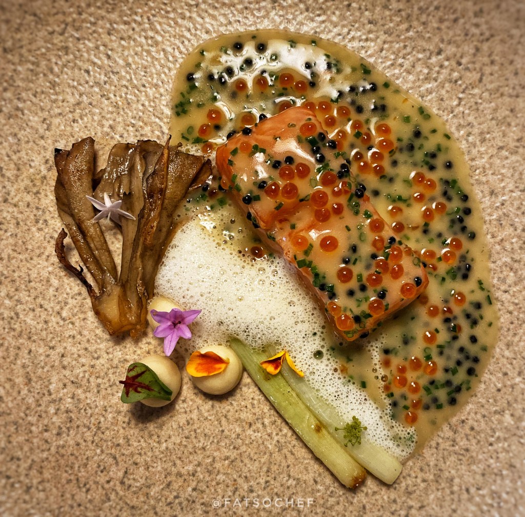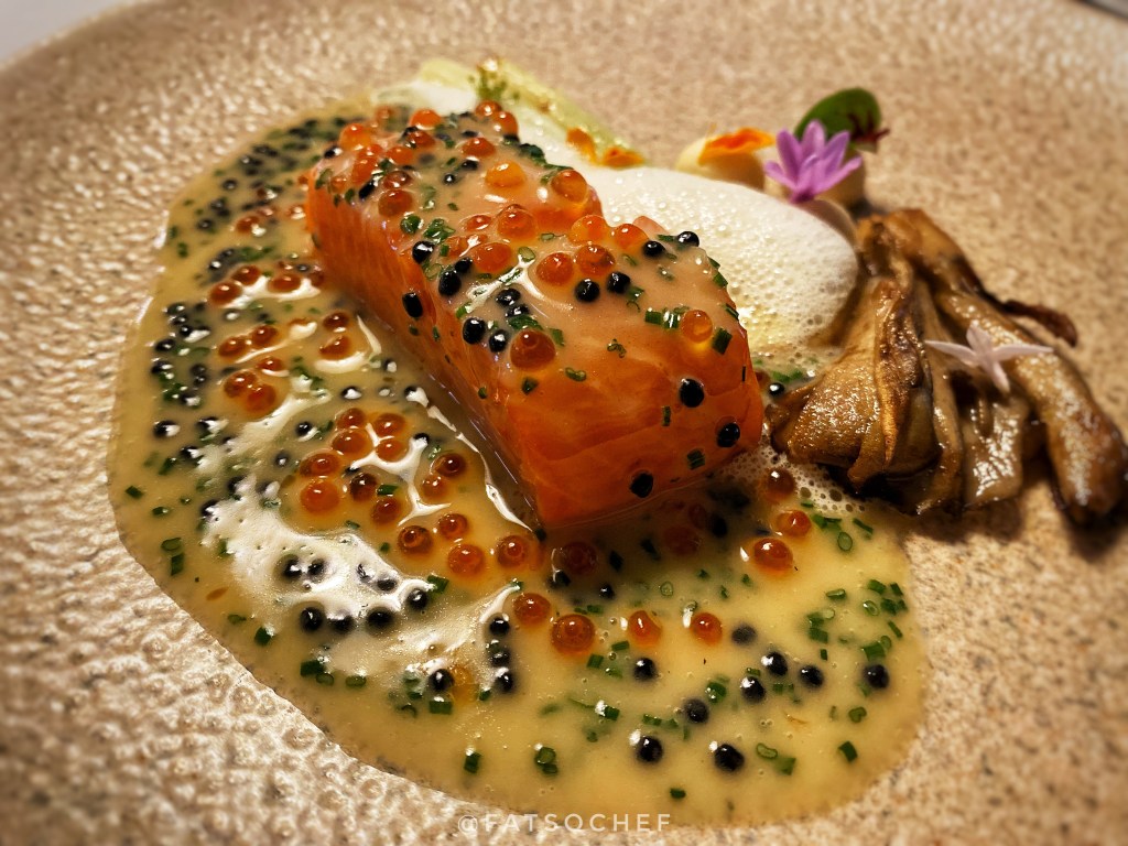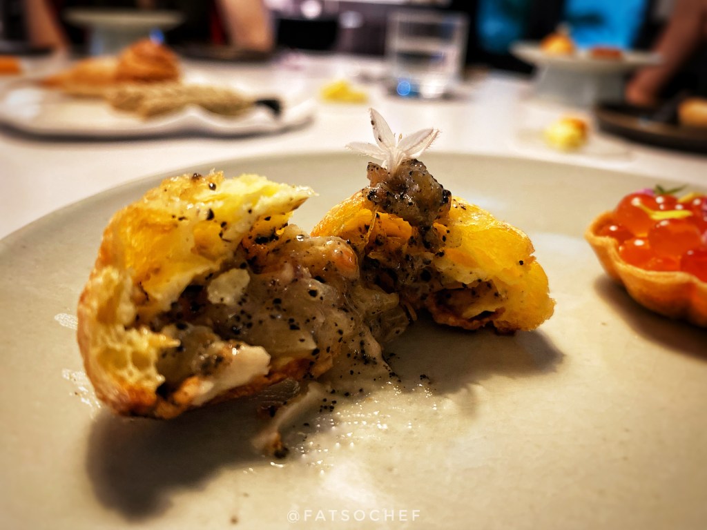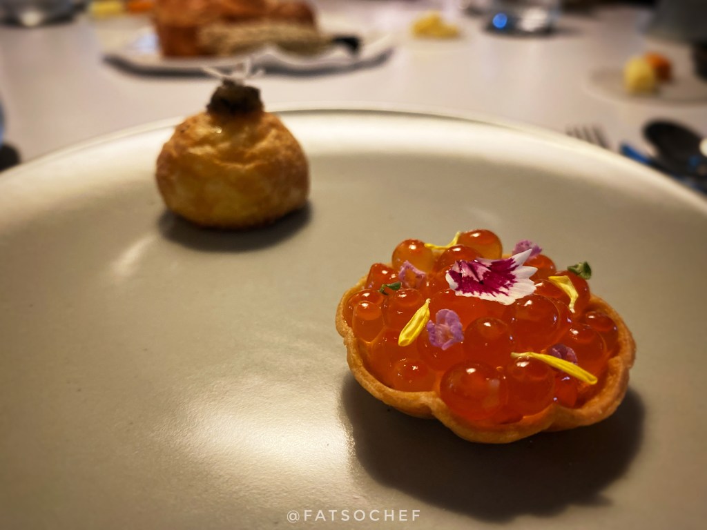 Following the hearty bakes, a couple of pop-in-the-mouth canapés, one mushroom filled Gougère, a type of French baked choux; and another, a tart filled with Salmon roe. Whilst the Tart looked irresistibly pretty and delicious, with its shiny gleaming roe beads and scattered petals; I enjoyed, much more, the creamy truffle infused mushroom-filled puff topped with a dollop of caviar. The contrasting texture between the choux and earthy mushrooms, whiffs of truffle and salty caviar, was delicious on the palate. The salmon roe tart was a little more straightforward; though I thought layering the savory roe over sweet crème fraiche before serving it on a crispy tart was a nice execution. As much as nobody would say no to a whole mouthful of pure Ikura, the bit of light cream actually balanced the flavors out nicely.