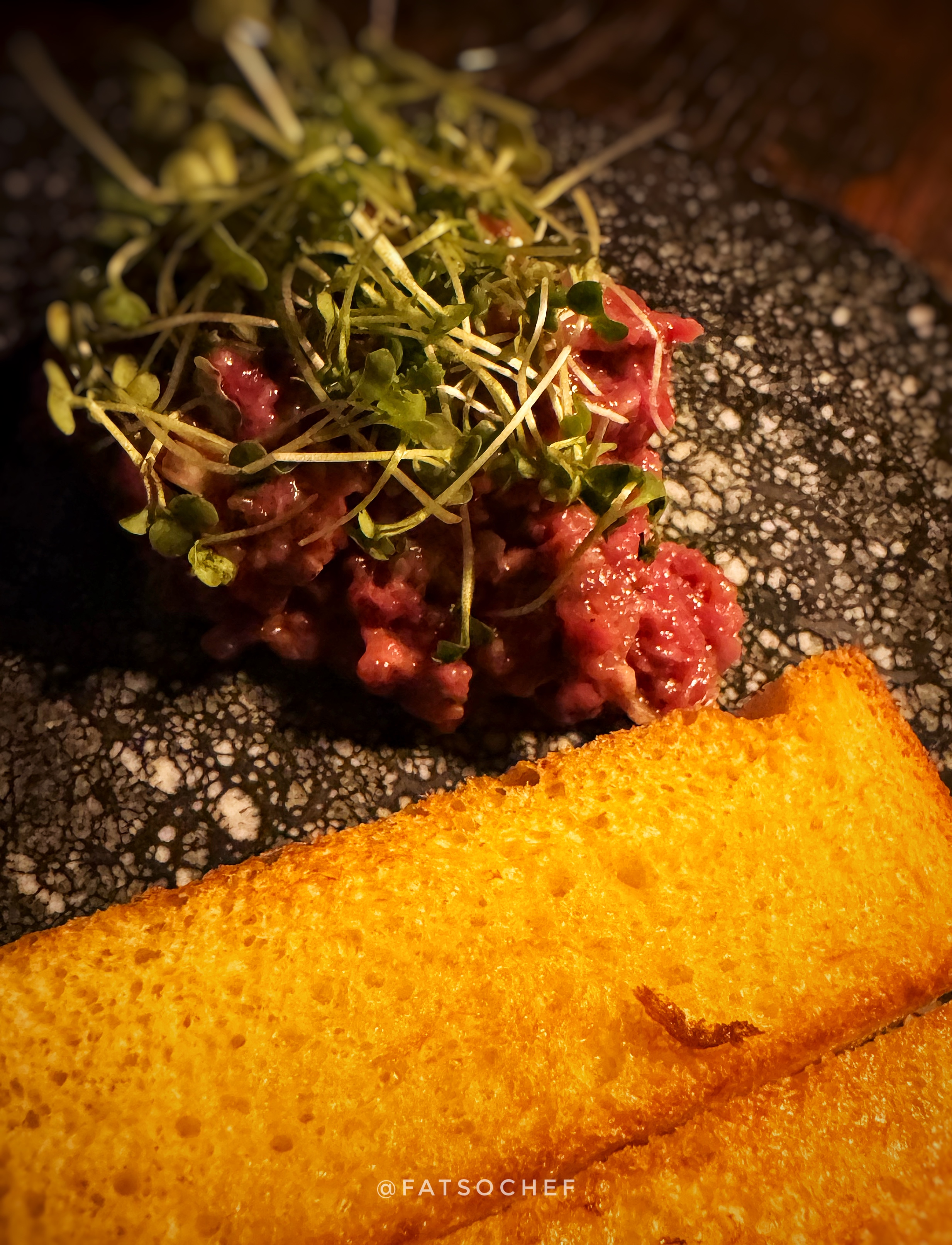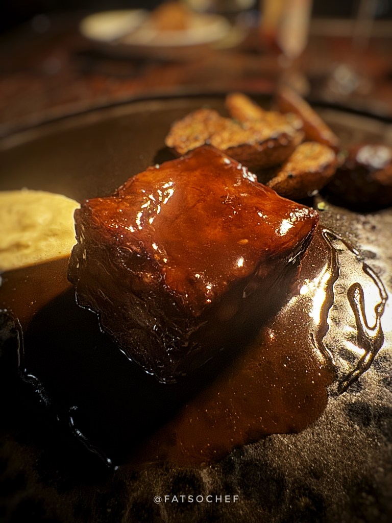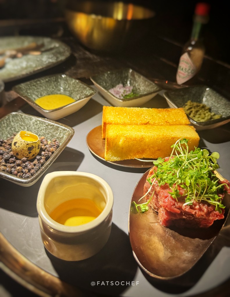 Our next starter, something we could never resist when we spot it, Age’d Beef Tartare . Prepped table-side, the hand chopped Angus beef was skillfully melded with capers, shallots, garlic, quail egg, mustard dressing, green onion, Age’d whisky, Tabasco, Worcestershire sauce and olive oil. The result was delectable, the beef was thoroughly “dressed”, the flavors were not overwhelming. Nicely done. Too much condiments tend to overpower the beef’s natural flavor, and I don’t like that.