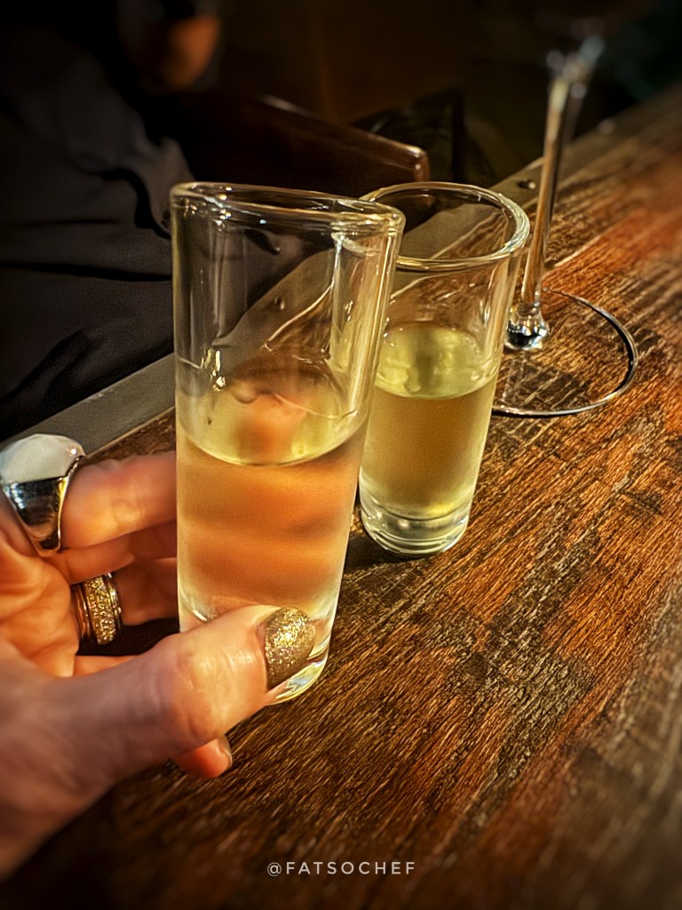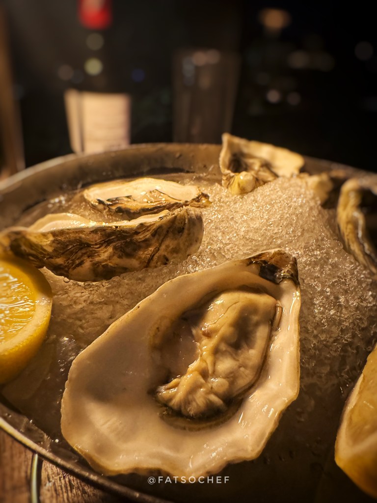 Next up, we asked for the fattest oysters they have and were recommended the Muirgen Irish No. 2. They arrived on a bed of ice, along with Mignonette, lemon and Thai Nahm Jim sauce. I like oysters naked with just a twist of lemon, so I can taste the natural flavors. But a second one with the Mignonette was appears to be equally good. Though these were far from the degree of “fat” for me, these slender oysters were very fresh and beautifully briny.