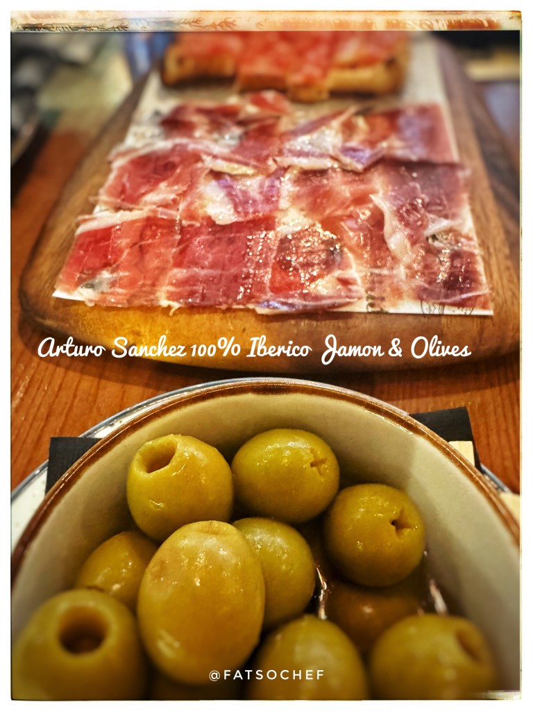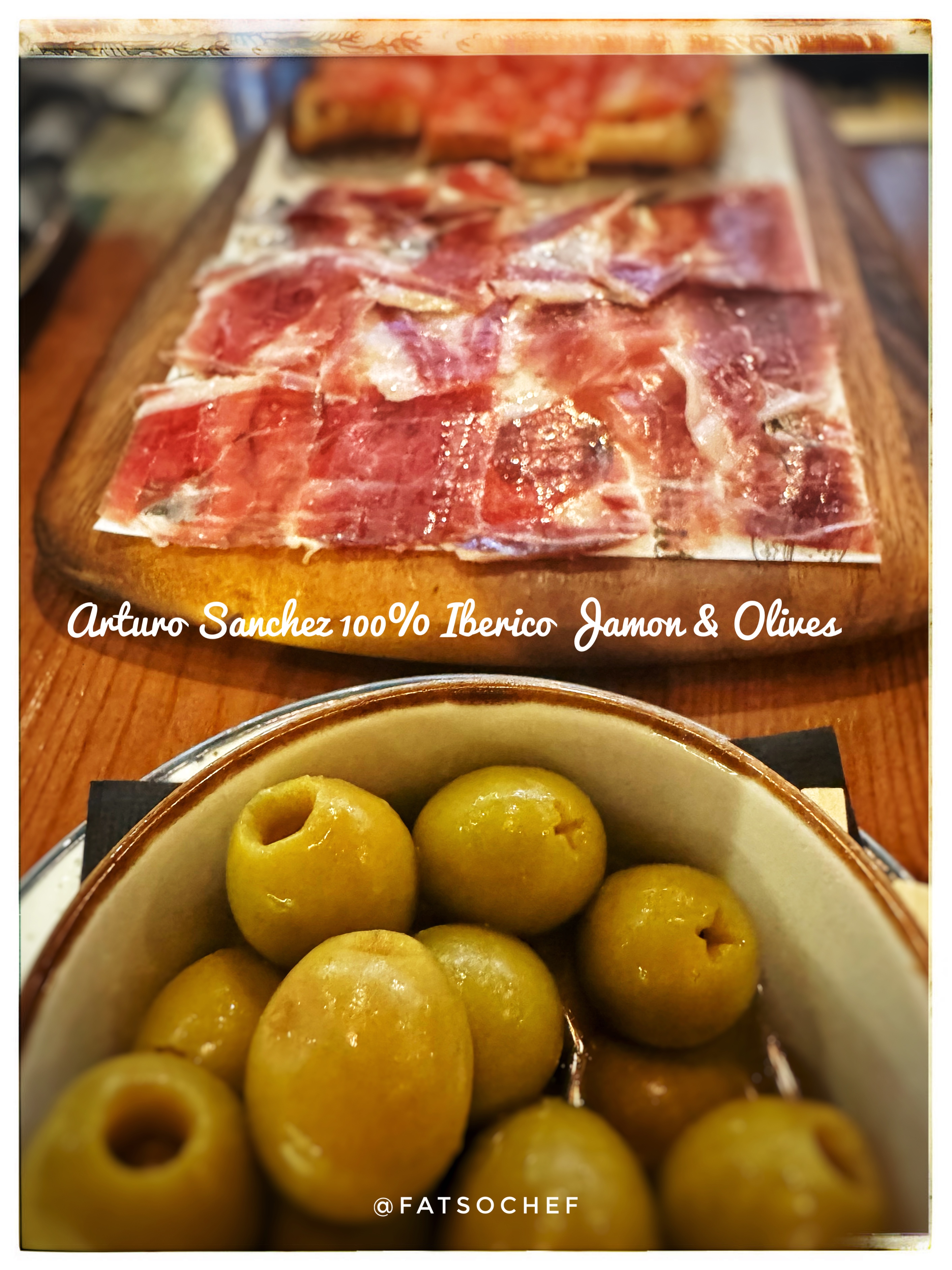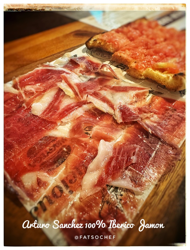 Arturo Sanchez 100% Iberico Jamon ~ A little of this fine cured meat goes a long way. That’s for most people. For me, I could have a ton of it! And then some more! Cut so paper thin you could read the words off the paper backing it came on. Irresistibly slick and oily on touch (I eat with my fingers, yes!), salty and the waxy on the tongue, a rich aroma that lingers on the palate even after it’s long gone down your gut. Unquestionably the king of Jamon and the pride of Spain. Pura Brasa hand slices the meat from a whole leg. This is the real deal!