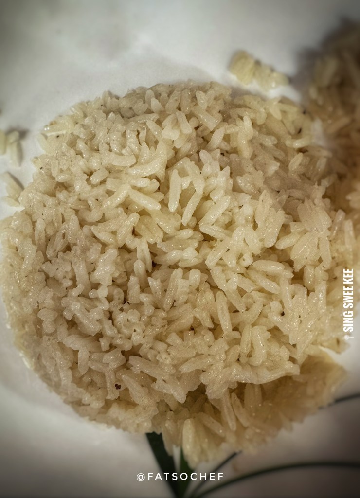Rice – Loose fluffy long grained rice that’s well oiled and moderately fragrant.